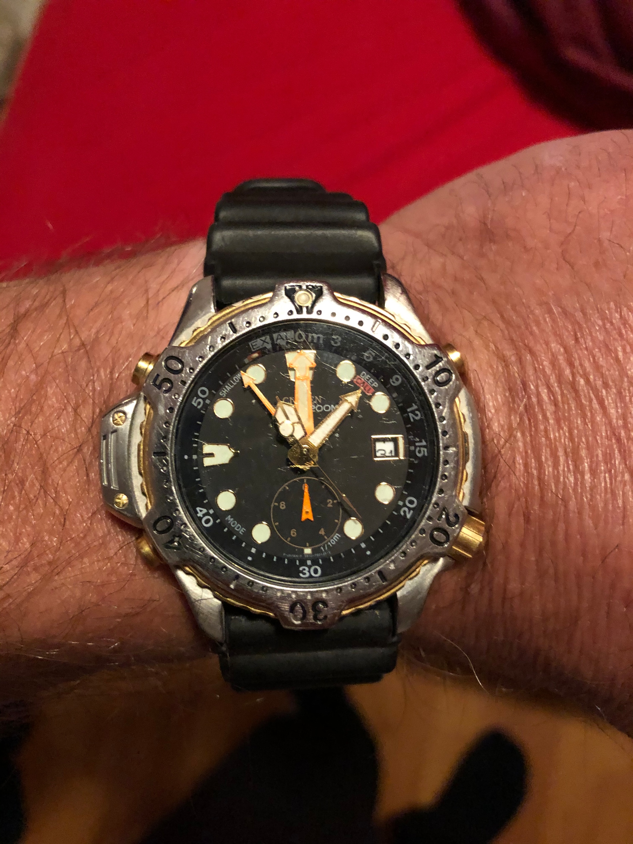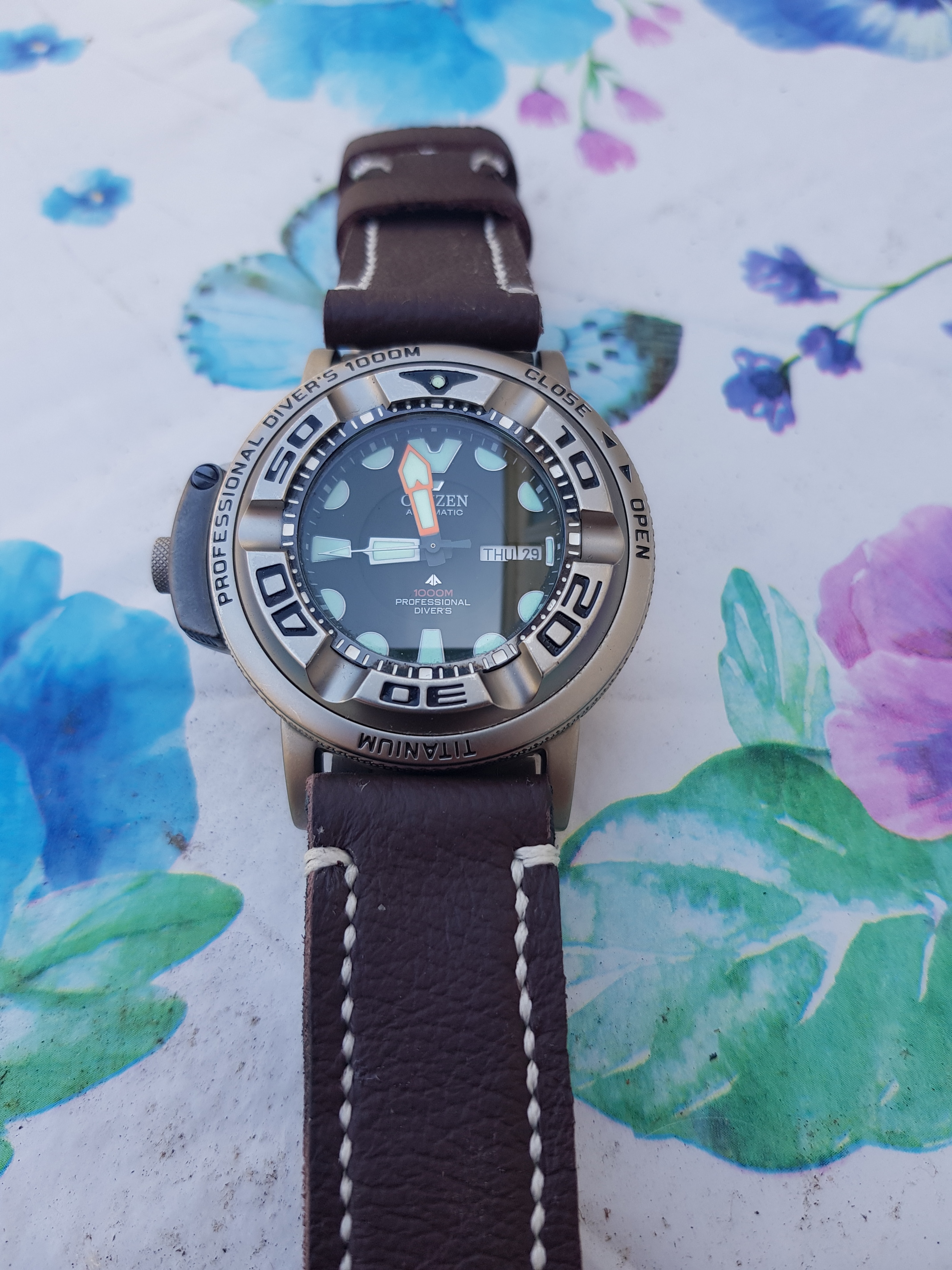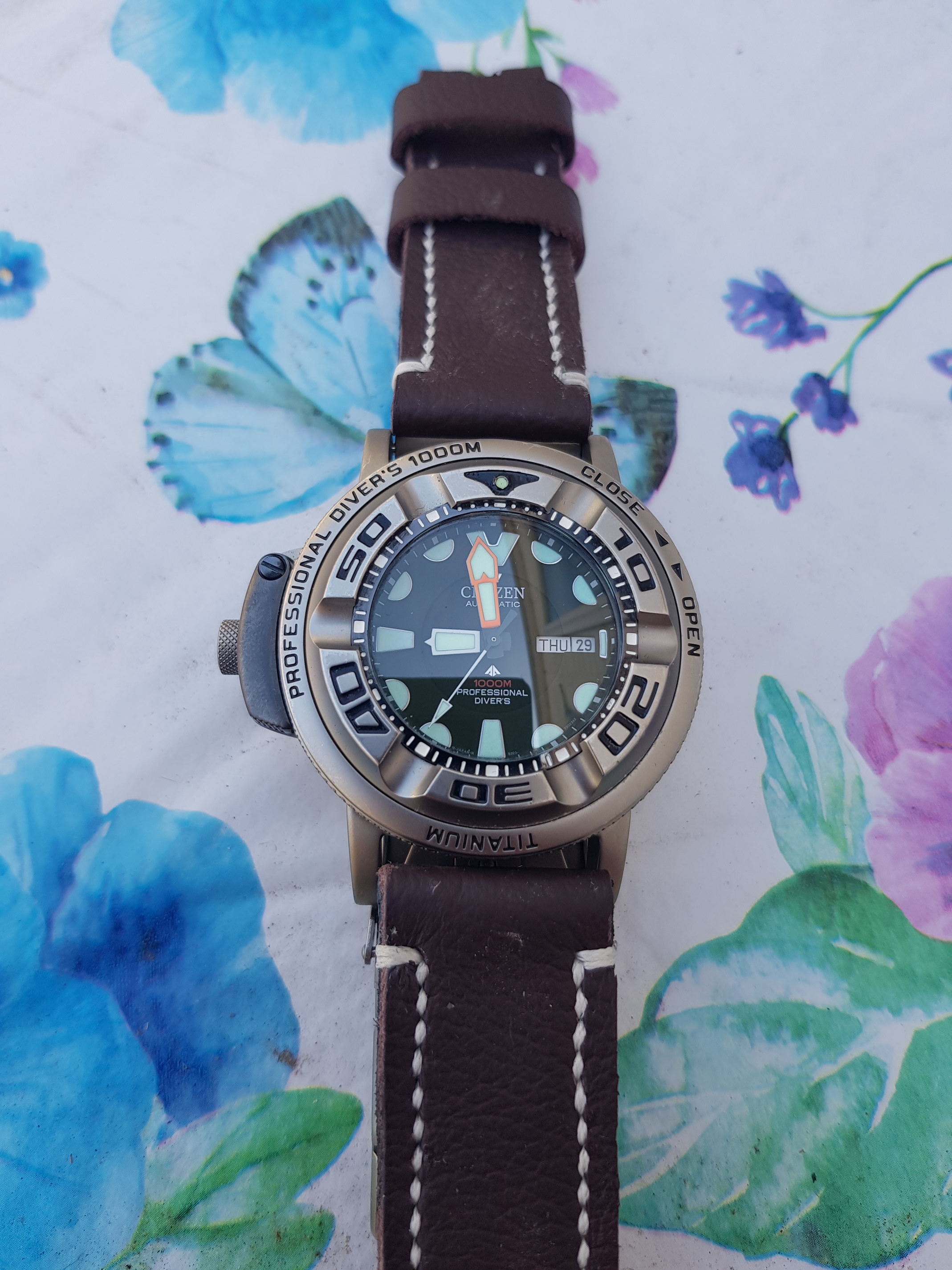 Mijn eerste Citizen. Het is een 72-6052. Het was een gokje voor weinig geld. Helaas bleek hij toch een service nodig te hebben. Glaasje en kast vervolgens een beetje gepoetst en voilà, op en top seventies! De wijzerplaat gaat afhankelijk van het licht van donker naar verblindend groen, wat nog versterkt lijkt te worden door het facet in het glaasje.