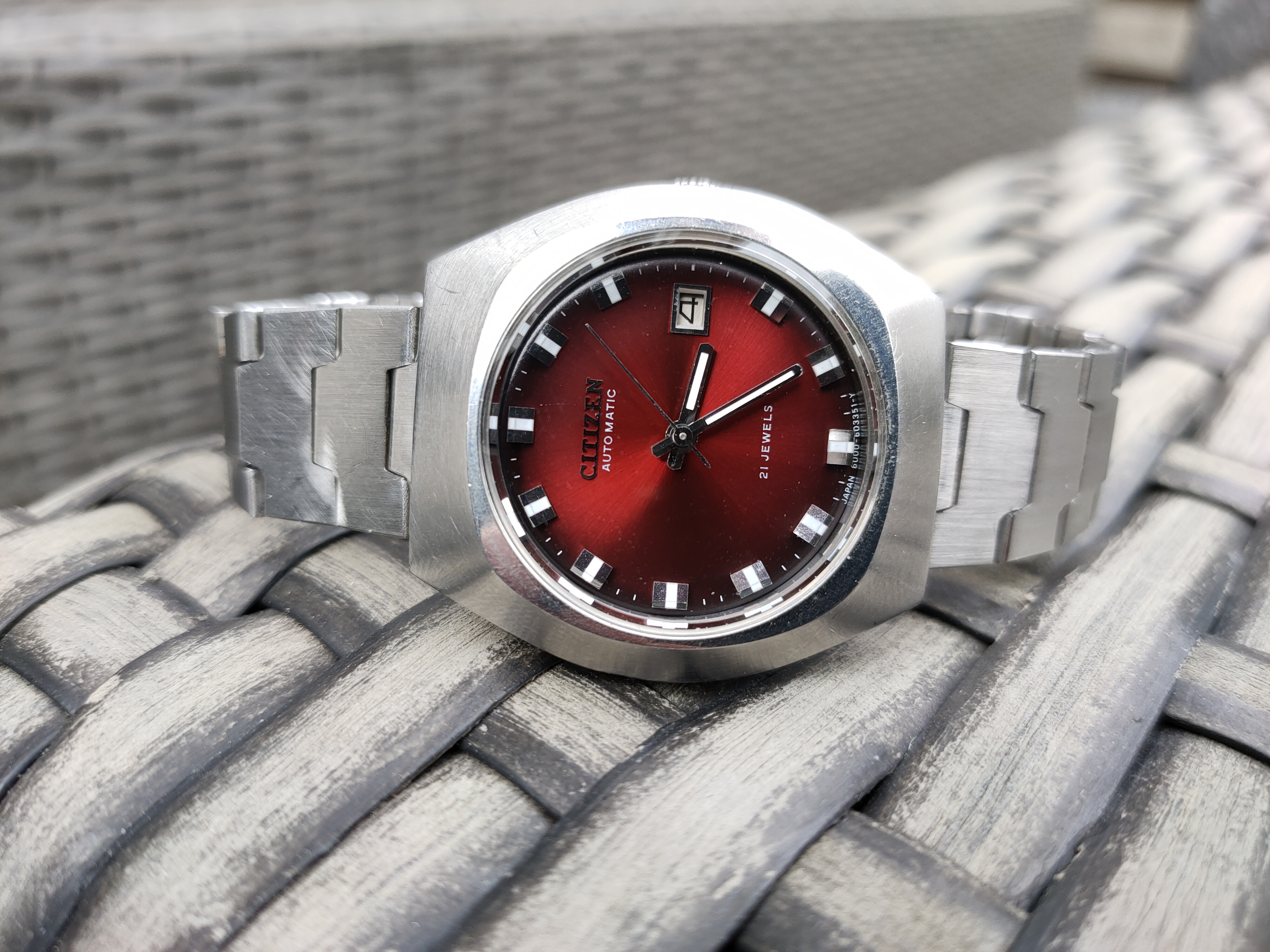 In mijn vintage woede zoektocht moest er ook een rooie komen…eindelijk deze tegengekomen op MP…voor een leuke prijs overgenomen maar glaasje was flink gekrast en hij liep niet goed…Door een gewaardeerde HF horlogemaker voorzien van een nieuw glaasje en een beurtje. Nu weer op de originele stalen band teruggezet waar hij op zat… grappig ding