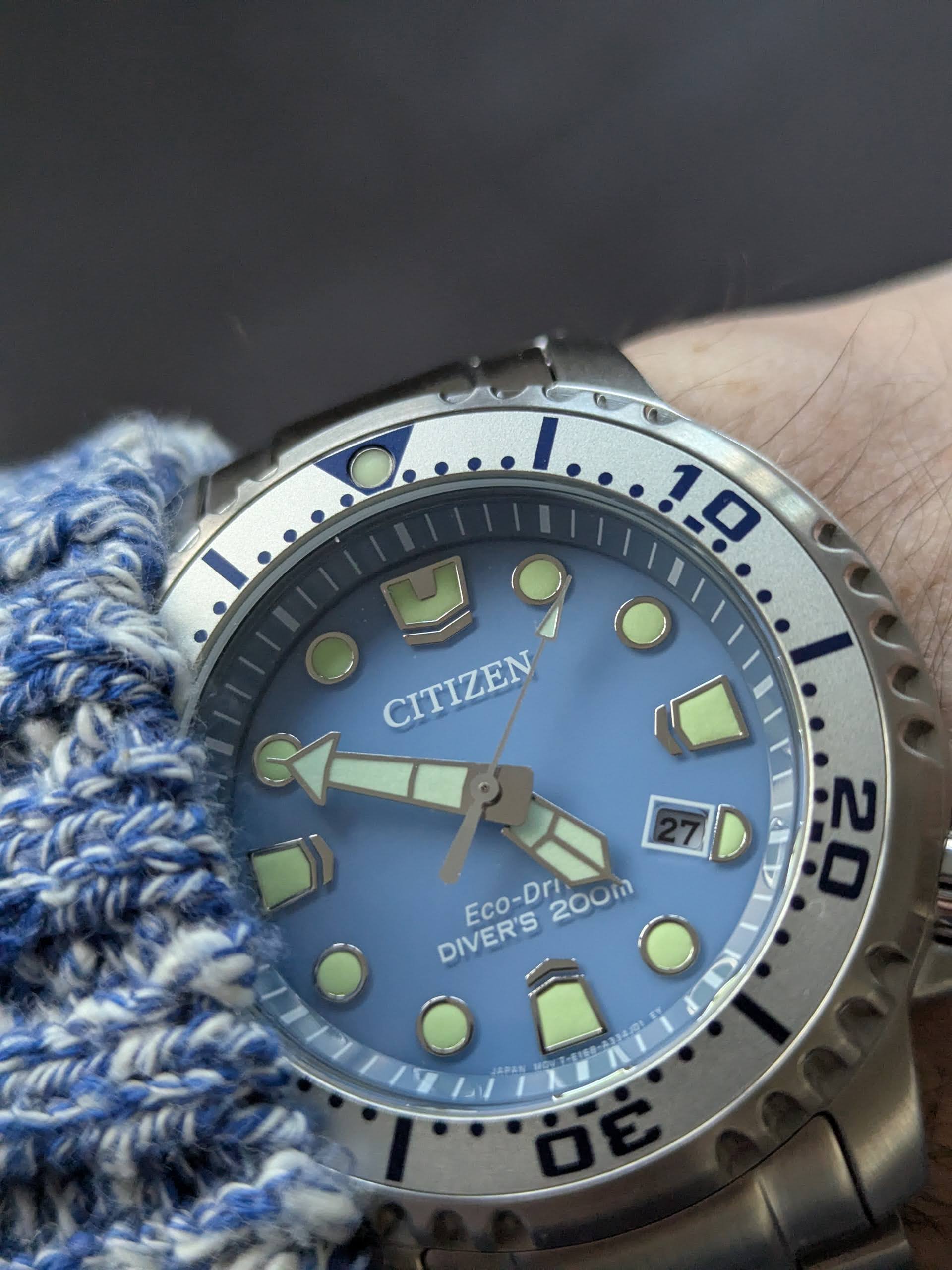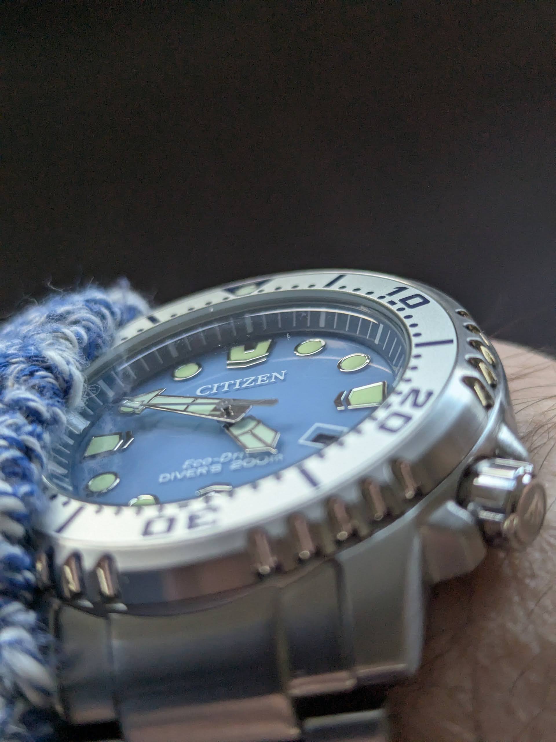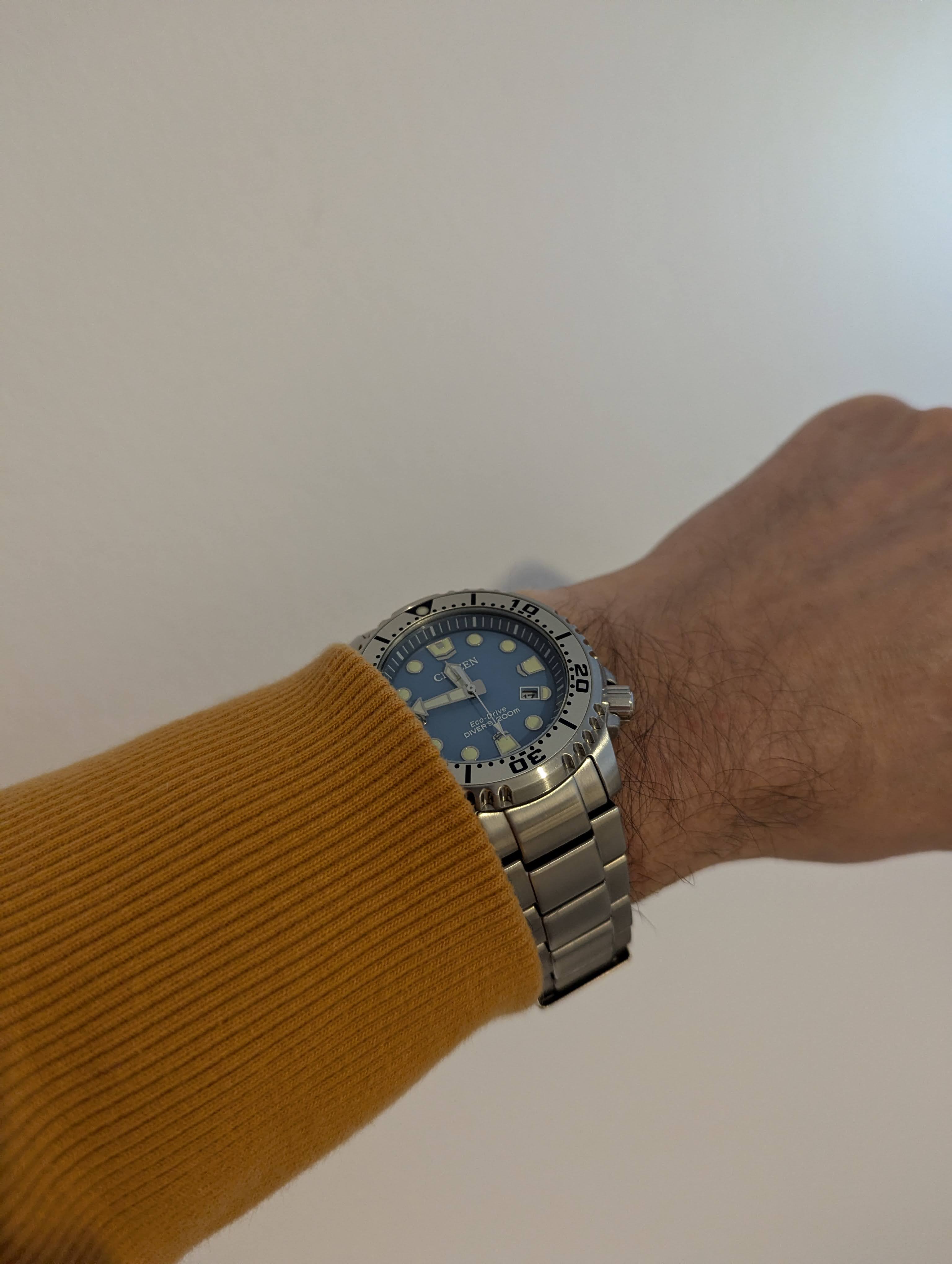 De Eco-Drive is bijzonder accuraat en de secondenwijzer loopt precies op de indexen, iets wat niet van elke quartz kan worden gezegd. De lunette is goed uitgelijnd (het is geen Seiko). Wat ik er persoonlijk mooi aan vond is dat de minutenwijzer niet in het oranje is, wat bij de zwarte en gewone blauwe wel is. Dat maakt ze iets serieuzer/minder speels naar mijn mening.