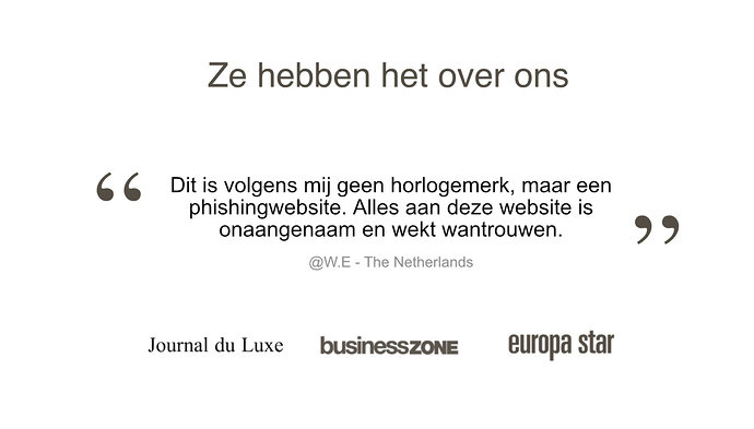 Ik heb op de koppeling van TS gedrukt om het artikel te lezen. Kan iemand mij een goede virusscanner aanraden? Dit is volgens mij geen horlogemerk, maar een phishingwebsite. Alles aan deze website is onaangenaam en wekt wantrouwen. Ook deze onheilspellende pop-up als je de website wilt verlaten: