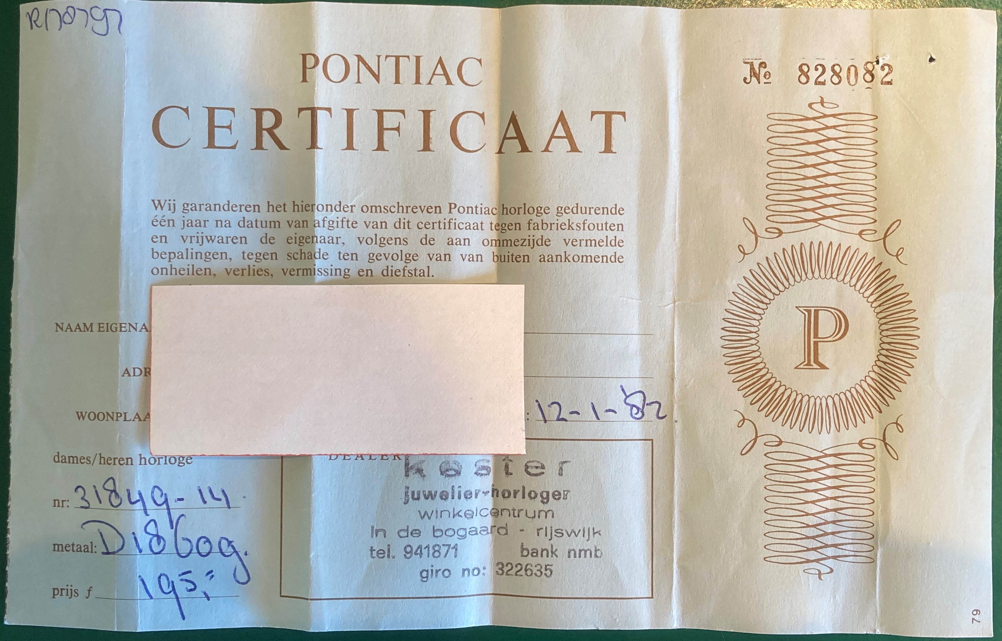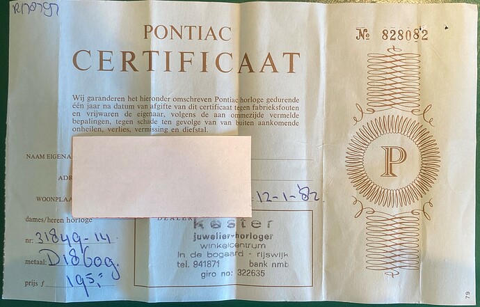 Het garantie bewijs zit er ook nog bij, in 1982 gekocht in de boogaard Rijswijk, 40 jaar geleden, ben benieuwd of deze juwelier er nog zit. De koper heb ik maar even afgeplakt, privacy, anders krijg ik nog op om mijn oren.