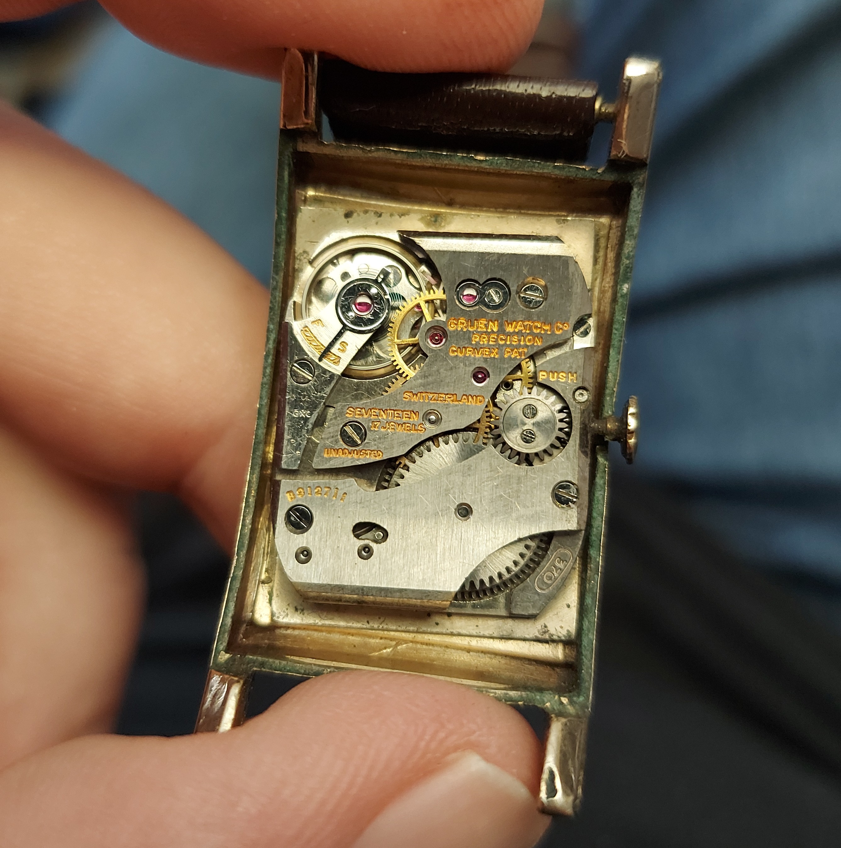 Leuke Gruen curvex in doos, zit nog wel wat knutselwerk aan, maar het (gebogen!) uurwerk ziet er nog goed uit.