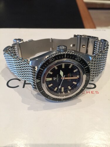 Ik denk dat over Crepas en de Tektite al veel gezegd is op het forum maar toch wil ik mijn recent verworven aanwinst even showen. Vanmorgen heb ik nummer 147 van SuperC overgenomen. Een schitterende wekker en een overcomplete set met allerlei soorten banden, schakels. Hoewel ik twijfelde aan de grootte van de Tektite (wat ik nog steeds doe, was eigenlijk op de markt voor een 47+mm Oris) heb ik hem toch overgenomen en meteen de mesh er even opgeschroefd.