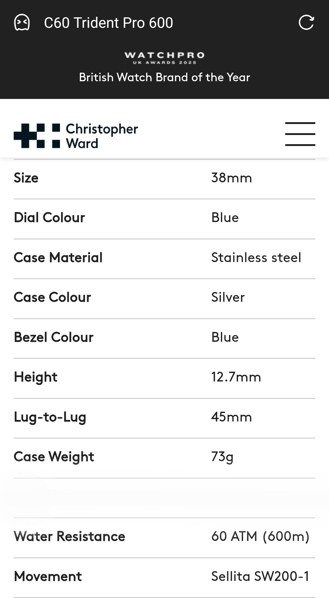 Merk en model: Christopher Ward C60 Trident pro 600mtr