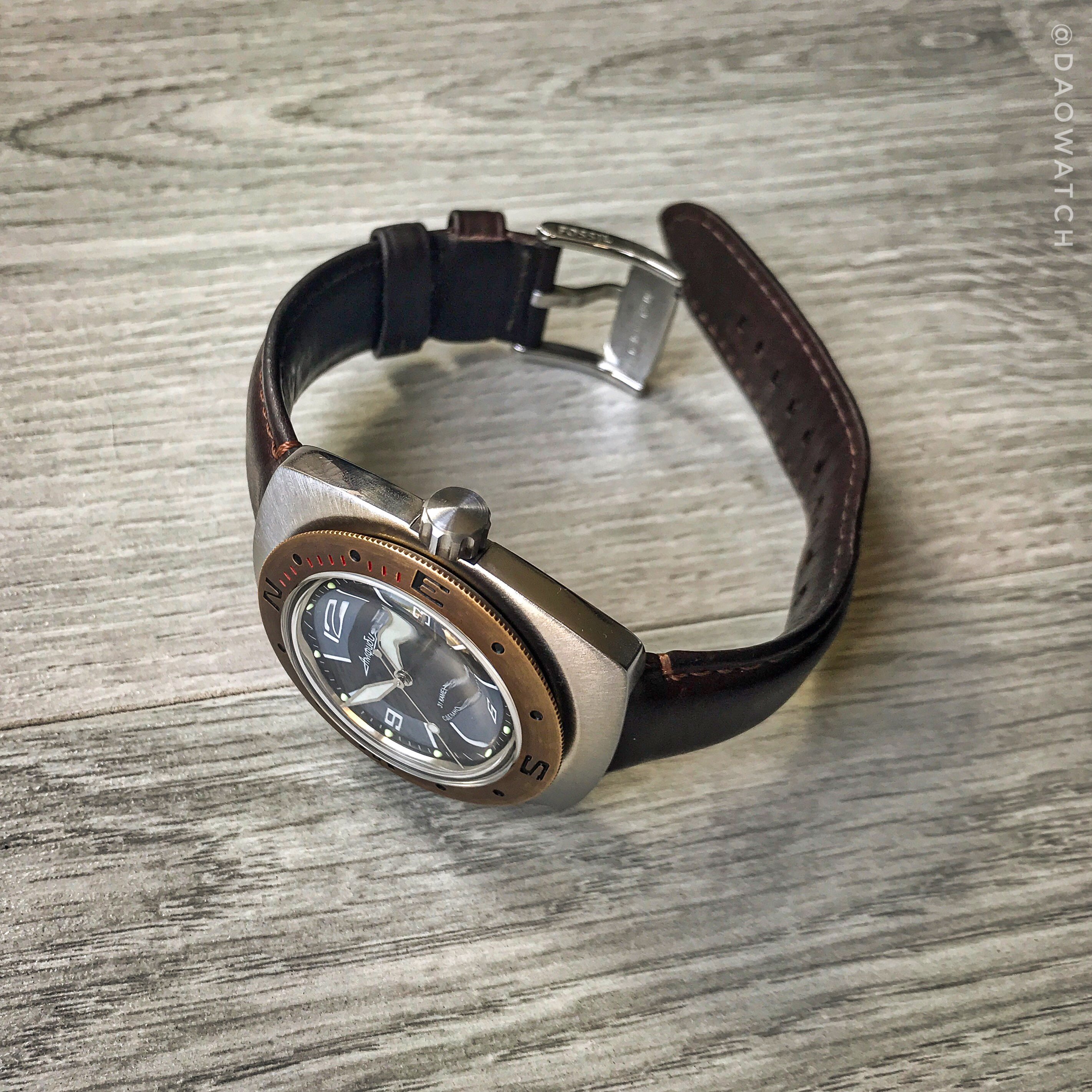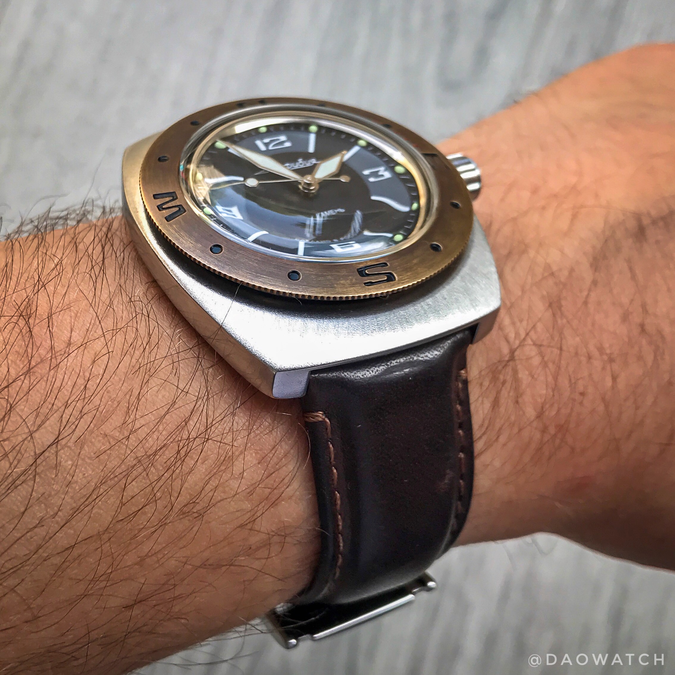 De bovenkant een sunburst brush gegeven, zijkanten gepolijst, secondenwijzer vervangen, ander bandje, met zoutzuur ontchroomde bezel die ik nog had liggen - en het is weer een heel nieuw horloge. Vanochtend wist ik nog niet dat dit ging gebeuren