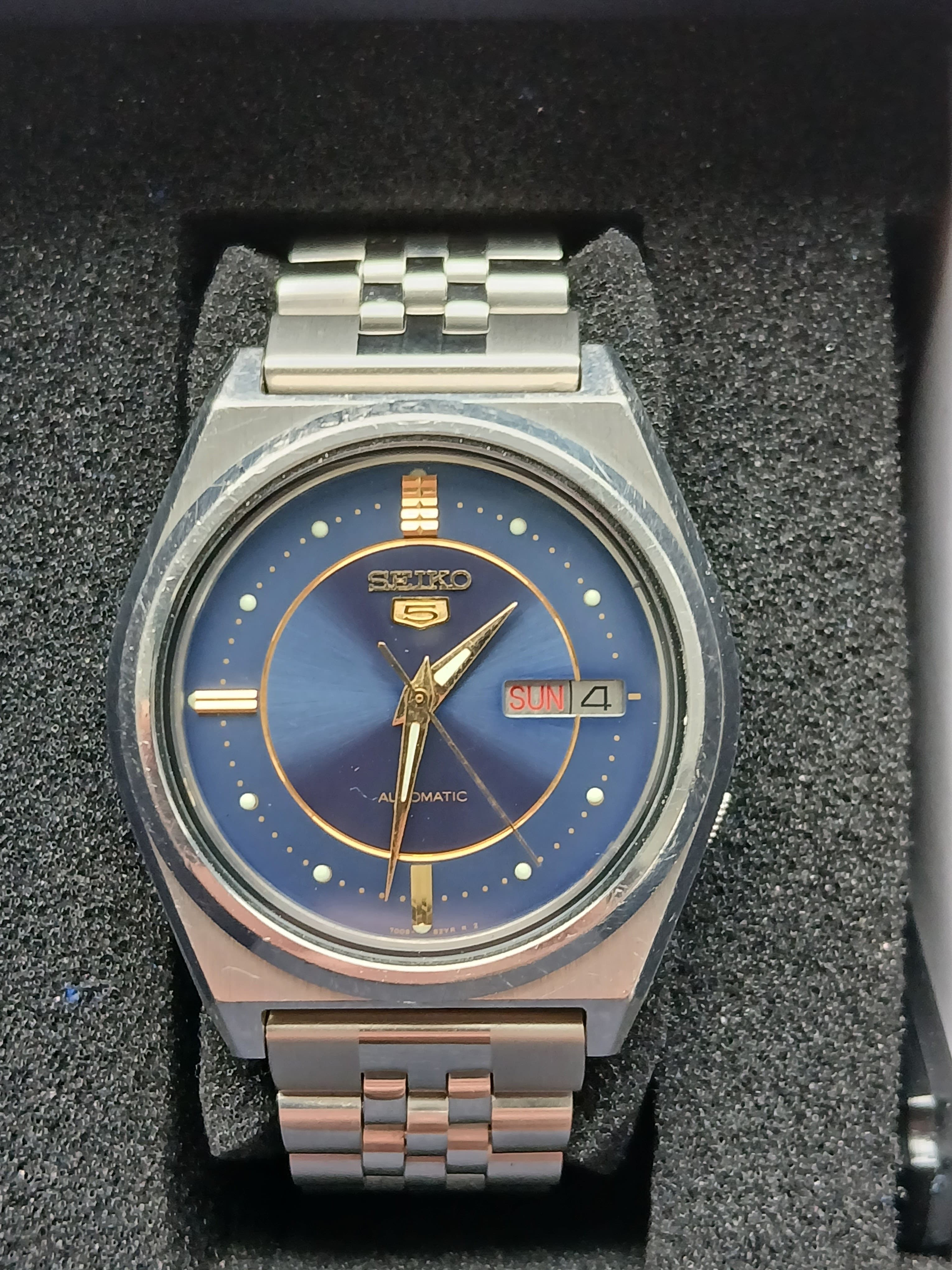 Het Ontwerp van de Wijzerplaat: Het horloge heeft een âsunburstâ blauwe wijzerplaat met zeer strakke, opgelegde goudkleurige indexen en kleine âlume dotsâ (lichtgevende puntjes). Dit specifieke minimalistische maar chique ontwerp is karakteristiek voor de Seiko 5-modellen uit de vroege jaren '90. Modellen uit 1982 hadden vaak een iets grovere afwerking of andere lettertypes voor de tekst âAutomaticâ.