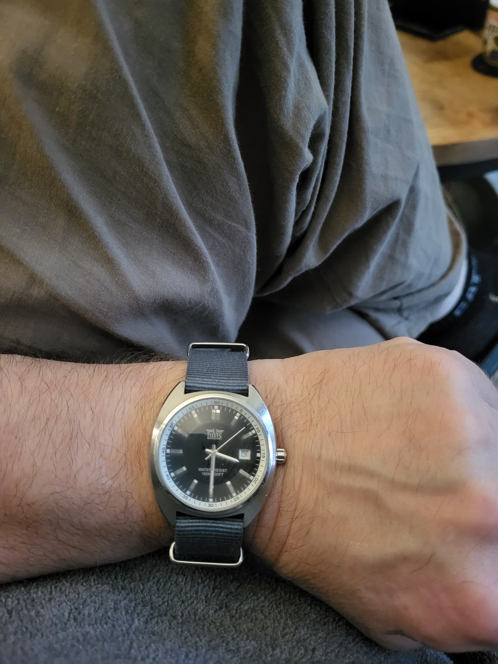 Maar ik had een punt in dit verhaal en daar zal ik nu naar toe gaan. Ik zag een stel horloges van het merk Davis, en dat zouden dan mechanische automaten moeten zijn…dus ik kijk beter en waarempel, horloges met moonphase, Big date, the works. Ik kreeg eindelijk de aandacht van de hooggeblondeerde 16 jarige verkoopster en mocht er na 5 minuten praatwerk geen vast houden. Maar de kast leek me wat grof, dik en niet erg net afgewerkt bij de kroon en de lugs. Ze kosten daarentegen…houd uzelf vast… tussen de 100 en 200 euro!