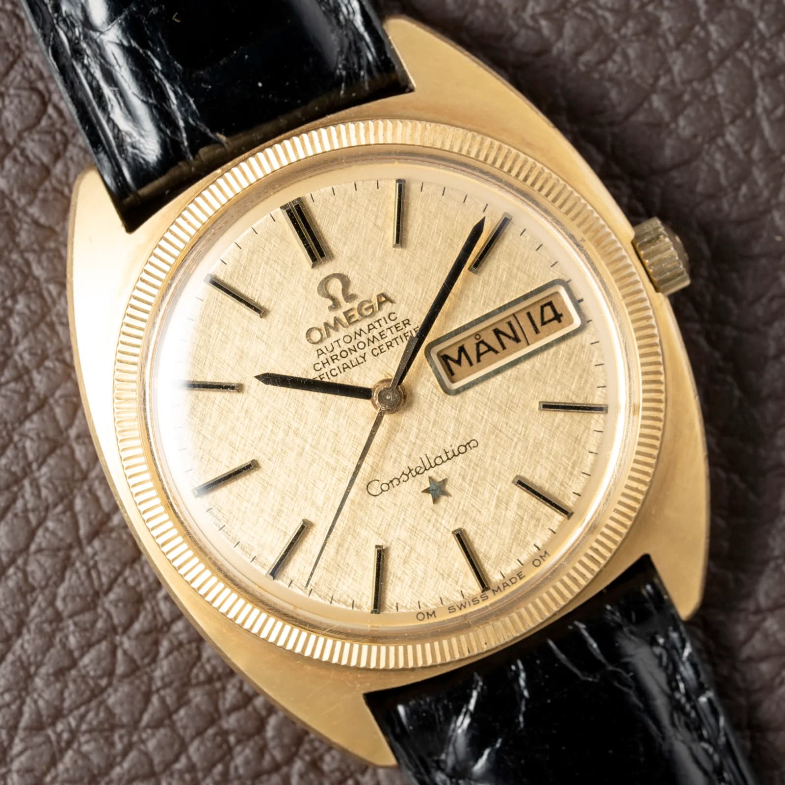 Je kunt op god’s groene aarde geen sjiekere day date kopen dan een vintage gouden Omega Constellation met linen dial, coin edge bezel, en day date op drie. Dit is in mijn optiek de absolute ne plus ultra van de day date horloges aller tijden. Het best mogelijke exemplaar zoeken kan een klusje zijn, maar goeie god, dit is de absolute bom. Daar haalt een Rolex of Tudor day date het niet bij. Kiek dan!
