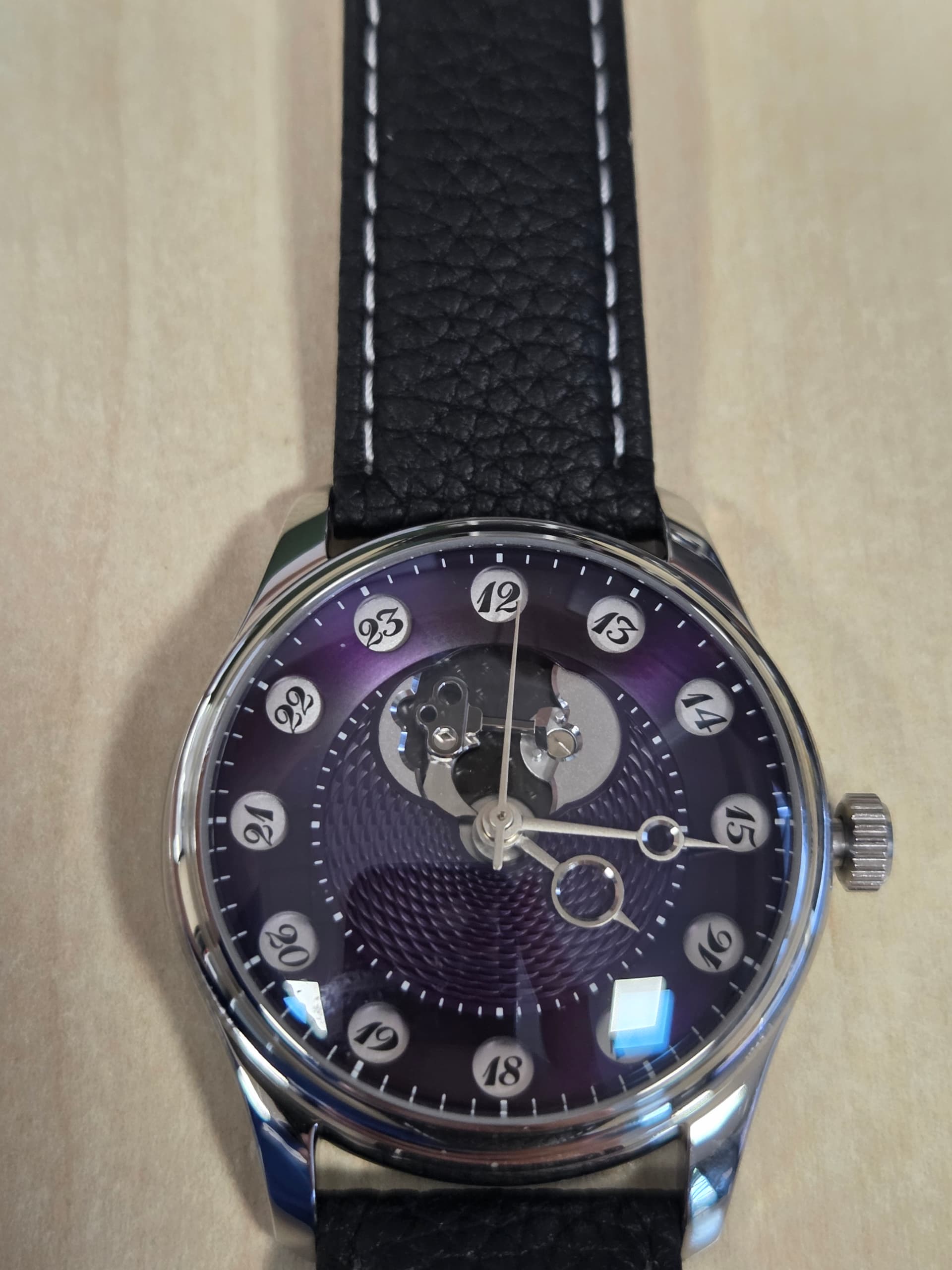 Dit mechanische horloge heeft een unieke complicatie waardoor de uurmarkerngen om 12 uur wisselen (van 0-11 naar 12-23 en om middernacht weer terug). Deze module is in eigen beheer ontwikkeld door Olti-8.
