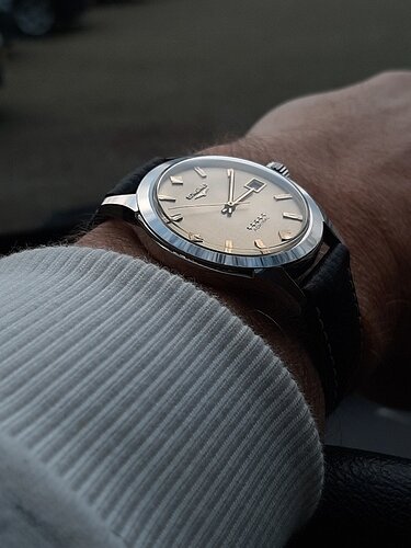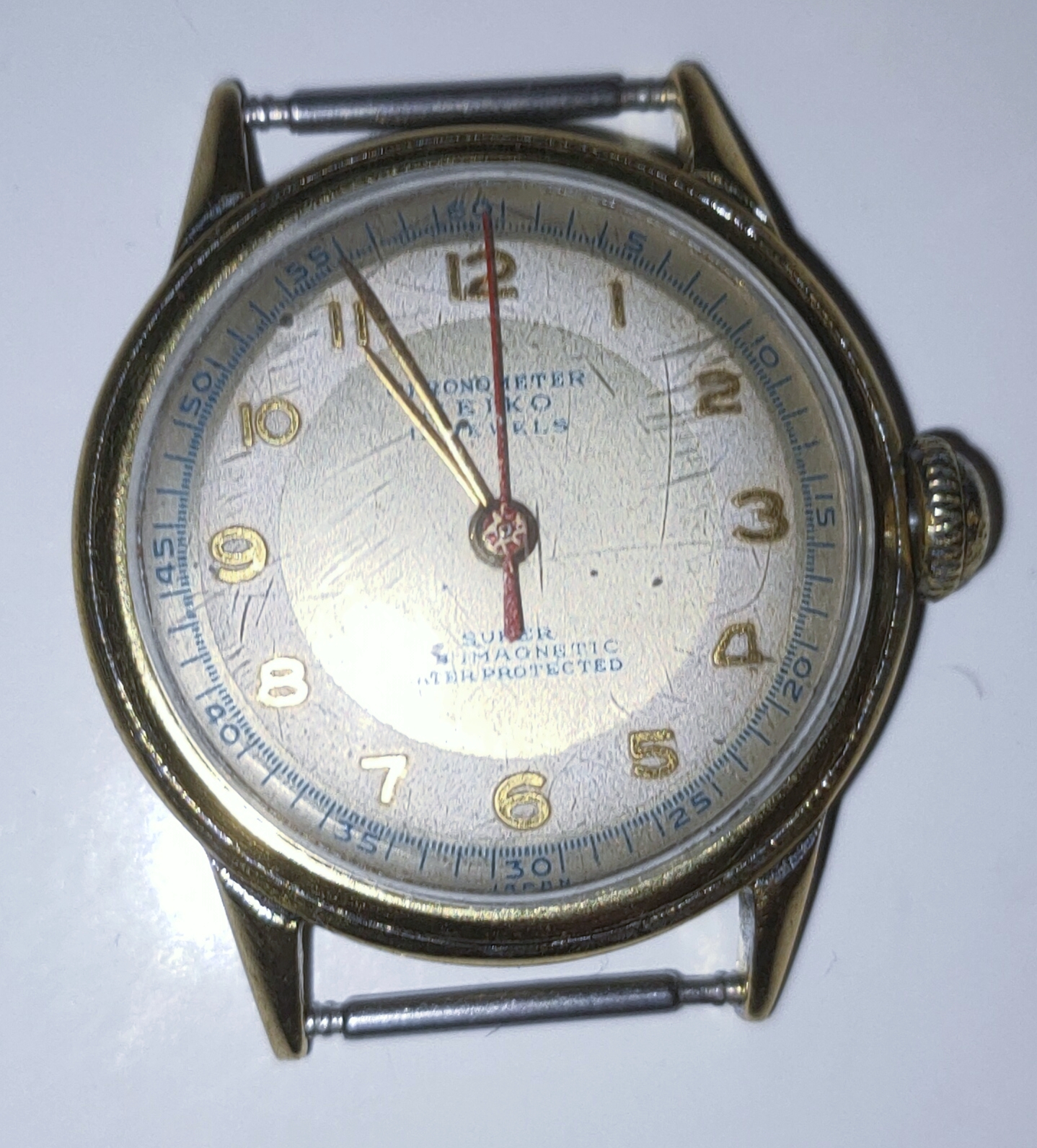 En deze, een Seiko Unique uit 1957. Een prachtige patine op de wijzerplaat… Het was defect, maar loopt nu weer, dankzij een donoruurwerkje, dat ik me gekocht heb. En ook nog vrij accuraat! Niet slecht voor zo’n oudje!