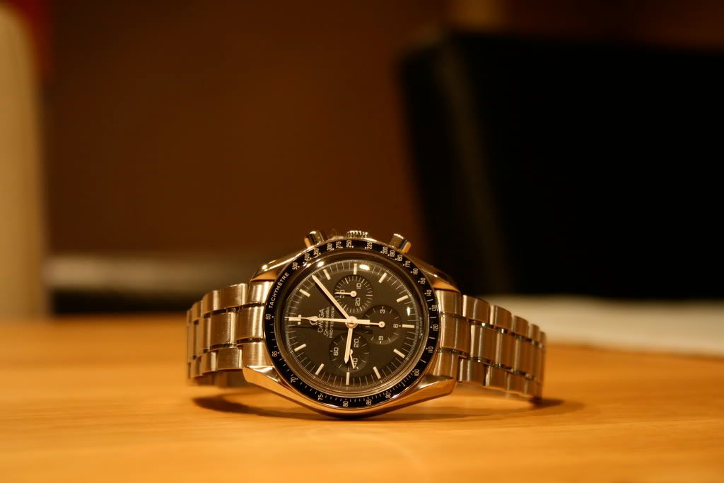 OMEGA Speedmaster Pro 30th anniversery handgewonden. Deze kocht ik twee weken geleden, het horloge is welliswaar 10 jaar oud, maar heeft eind 2008 een grote beurt gehad door OMEGA, en is als nieuw. Op de tweede foto zie je dat ik er ook een (non-OMEGA) lederen bandje bij heb, uiteraard wel een originele OMEGA vouwsluiting.
