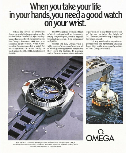 Het is niet enkel raar dat ze over batterijen in horloges spreken (ik snap het niet), deze ISO norm is pas in 1982 opgesteld, de norm over magnetisme in 1973 en de norm over schok resistentie in 1984. Veigen na Pasen, want tegen die tijd was Jacques Cousteau al op pensioen; en tegen dan was een duikhorloge main-stream.