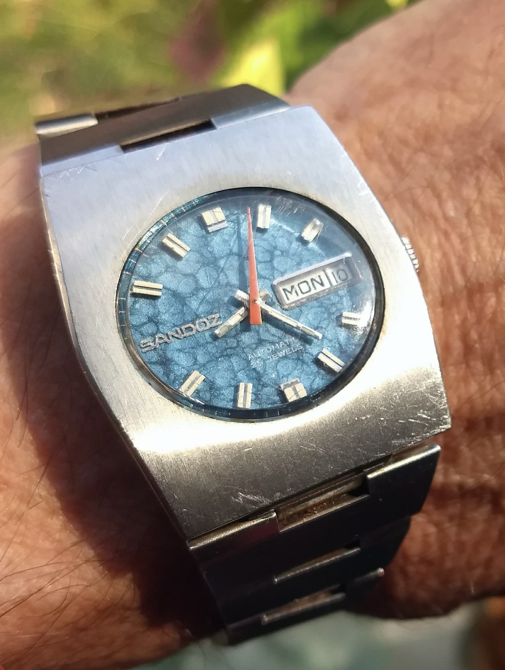 ? Het bijzondere is dat de plaat onder de juiste hoek effen lichtblauw wordt. Blijft een feestje om mijn pols!