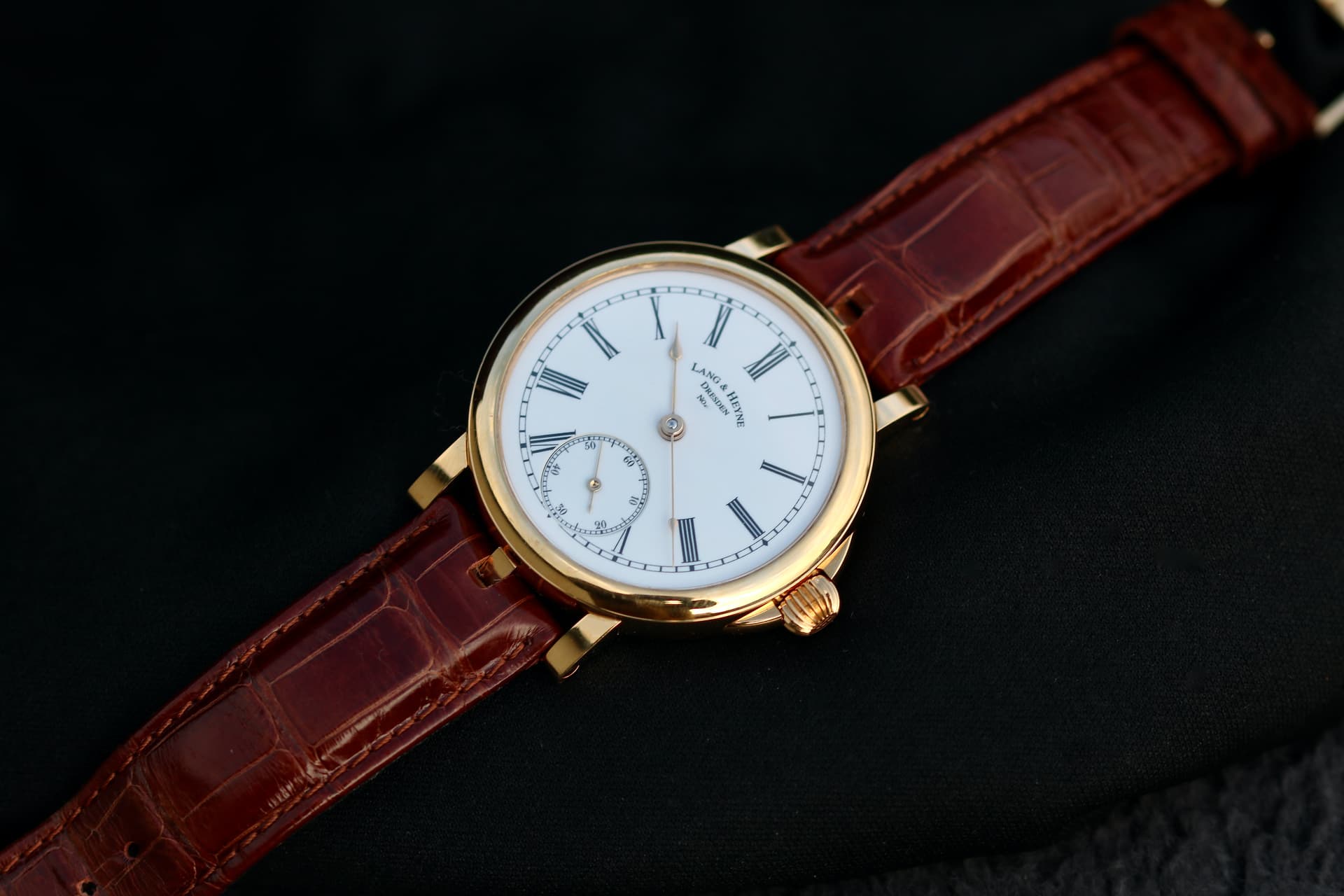 het formaat is vrij stevig, oogt kleiner op de pols maar 43,5 mm is geen klein horloge zoals wat de huidige miezerige hype dicteert. Ik hoop niemand tegen de borst te stoten maar wat sommige vandaag zien in petieterige Cartier’kes van 32 tot 35 mm snap ik niet :-). Dat ter zake, die L&H lijkt eerder 41-42 mm op de pols wat uiteraard nog steeds ’ stevig’ is.