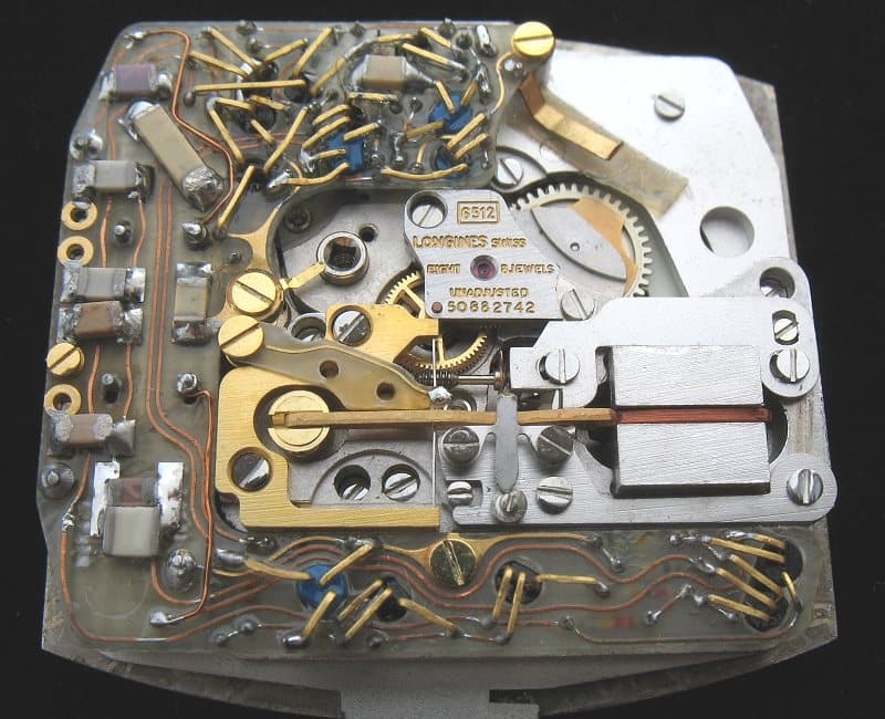 En het kon nog veel bonter in de beginjaren, zoals dit met de hand gesoldeerde apparaat, de Ultra-Quartz van Longines: