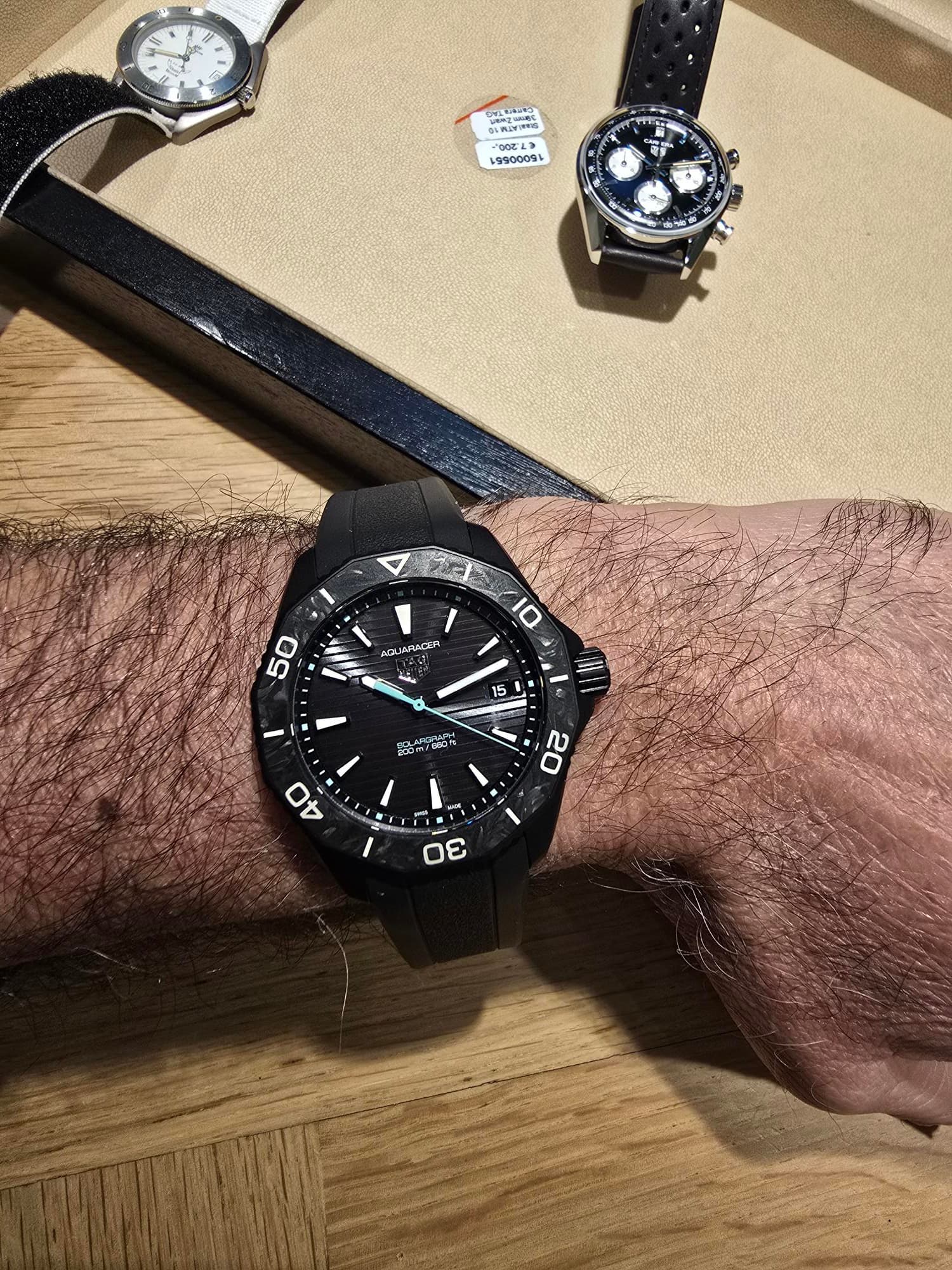 Eén ding is zeker; een milanese is niets voor mij. Ook de Breitling Endurance Pro niet (niet eens op een polsfoto gezet). De titanium versie van de Tag Heuer Aquaracer Solargraph heeft de voorkeur boven de DLC.