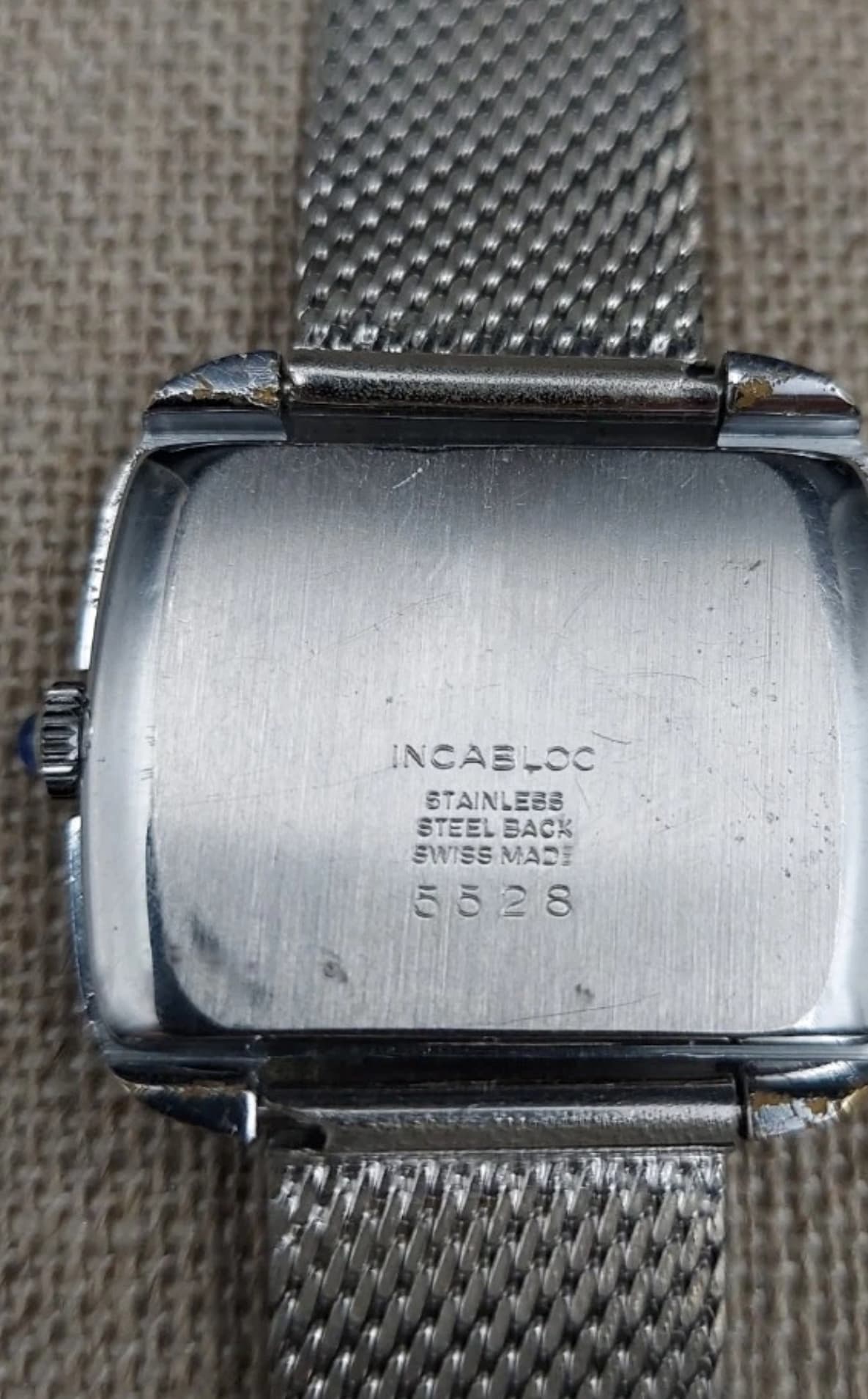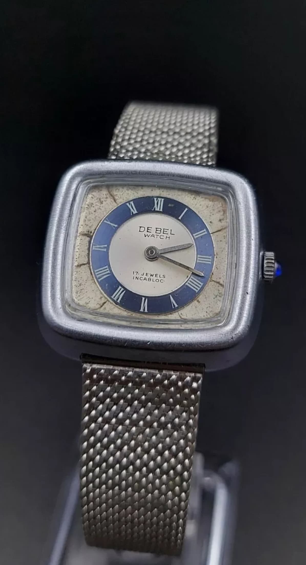 Dit horloge heeft een achternaam uit onze familie op de wijzerplaat staan. Debel op z’n Frans, al lijkt dit ook De Bel te kunnen zijn. Het uurwerk is Swiss Made, maar oogt als een veel ouder tank-uurwerkje in een jaren '70 kast. De patina en band brengen mij in verwarring, want ik zou dit model als laat jaren '70 bestempelen.