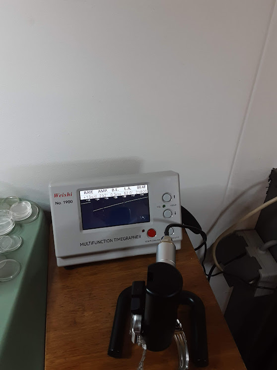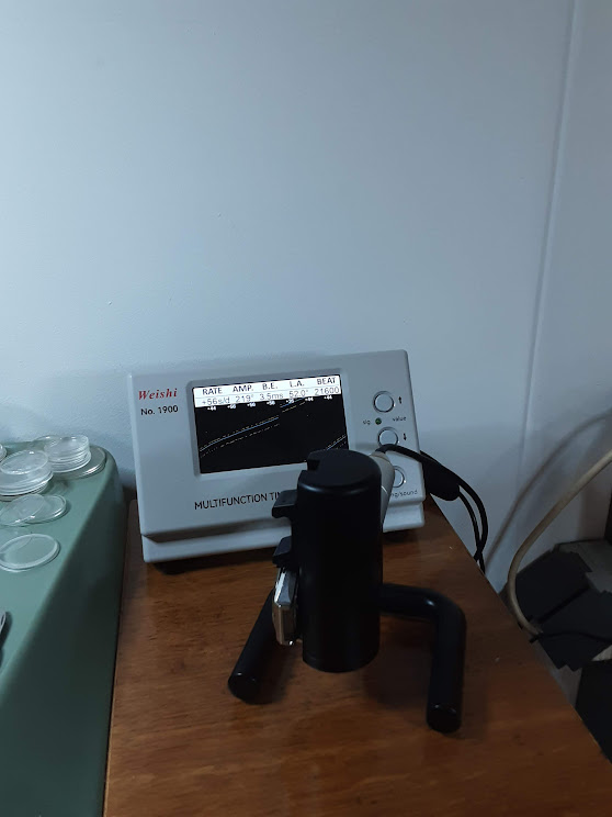 Problemen bij aanvang: glas beschadigd, stopknop die blijft hangen, een redelijk lage amplitude en een vieze driedubbele lijn op het afregelmachientje.