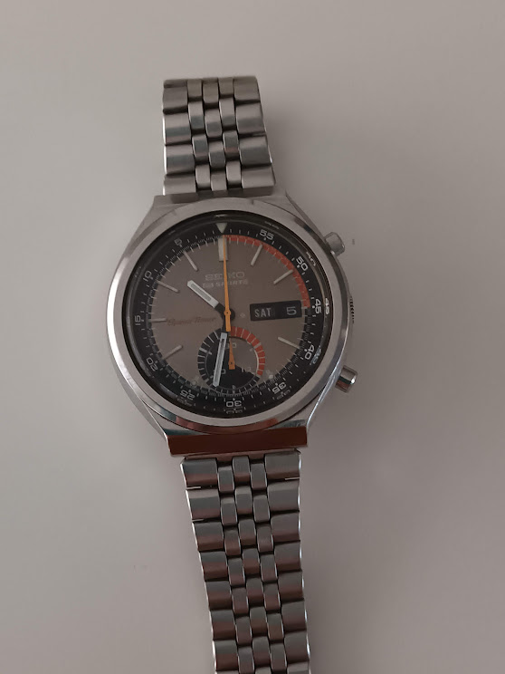 Nieuw glas en nieuwe knoppen zijn onderweg uit de USA om het echt helemaal toppie te maken. Juist nog ergens een seiko clasp opscharrelen om het echt af te maken. De originele band ga ik voor passen, die is zowaar dubbel zo duur als het horloge zelf.