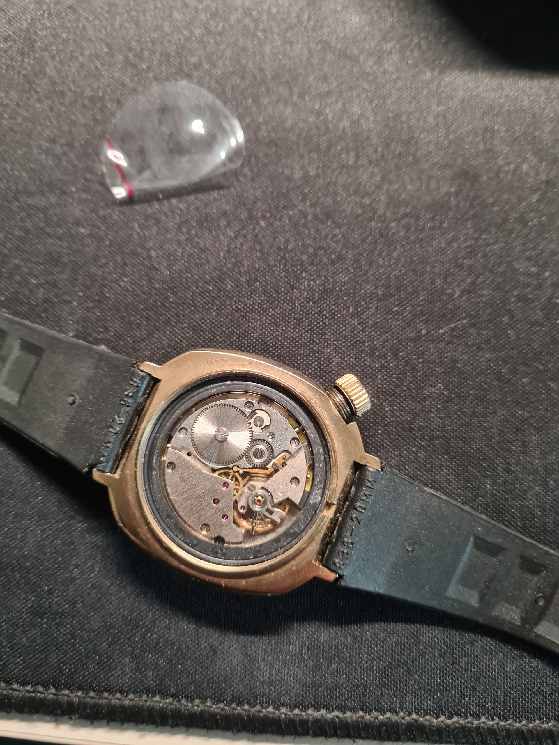 Hij liep niet en ik kon hem niet opwinden. Toen kwam ik er achter dat hij wel begon te lopen als je de kroon helemaal uittrok en in een bepaalde hoek hield. Open gemaakt en het grote tandwiel van het opwindmechanisme zat los, de schroef zat er gelukkig nog wel in.