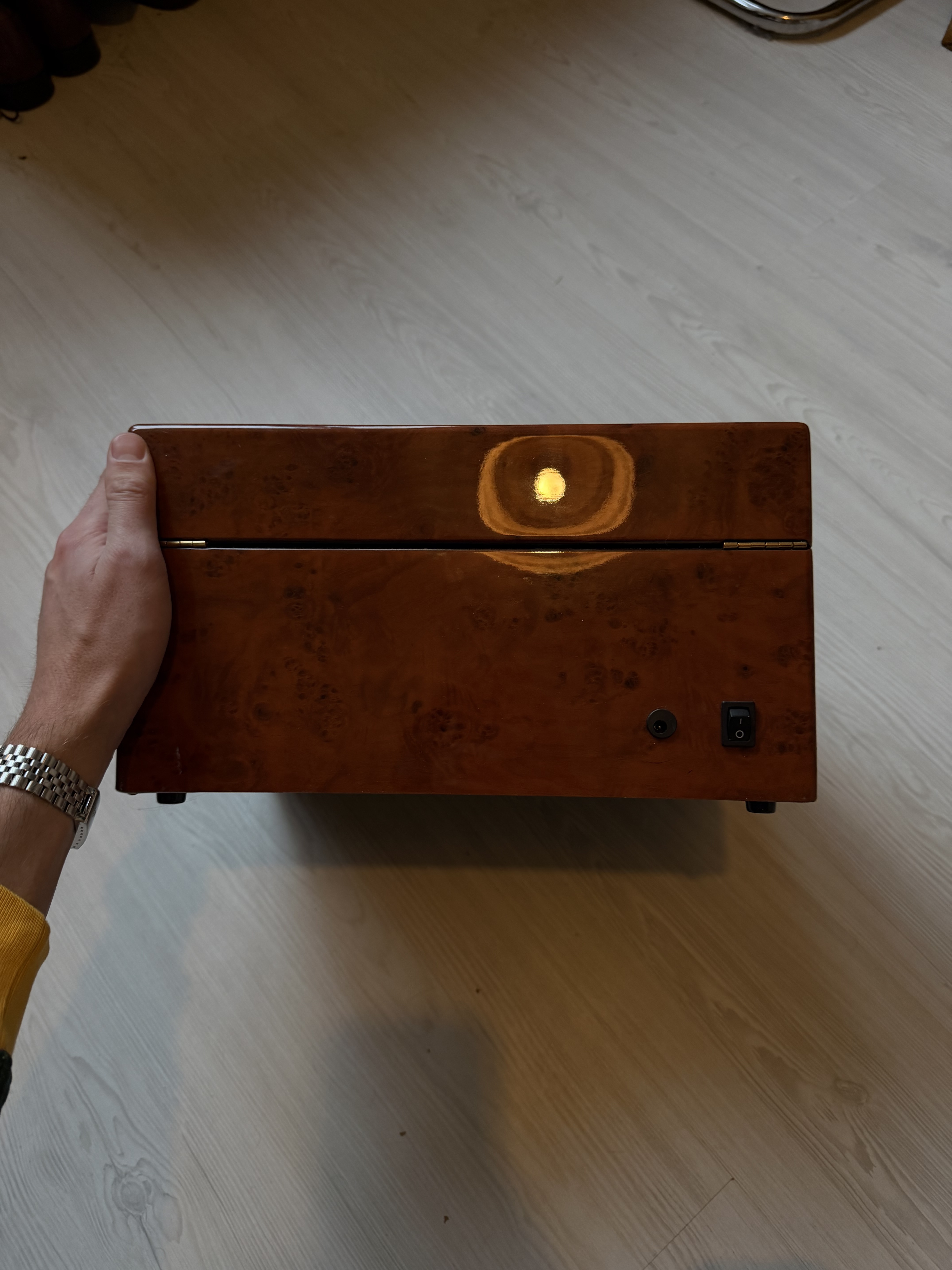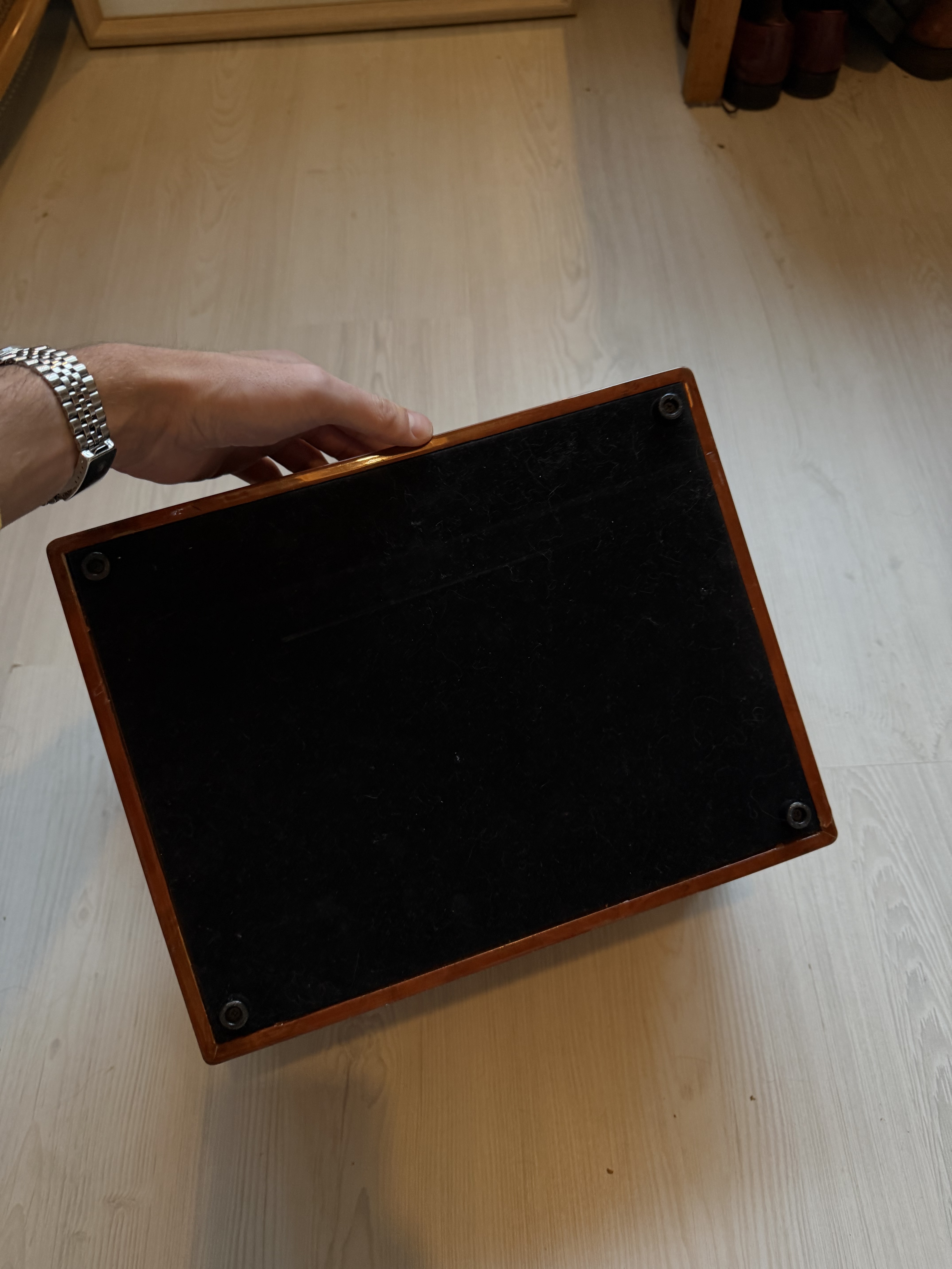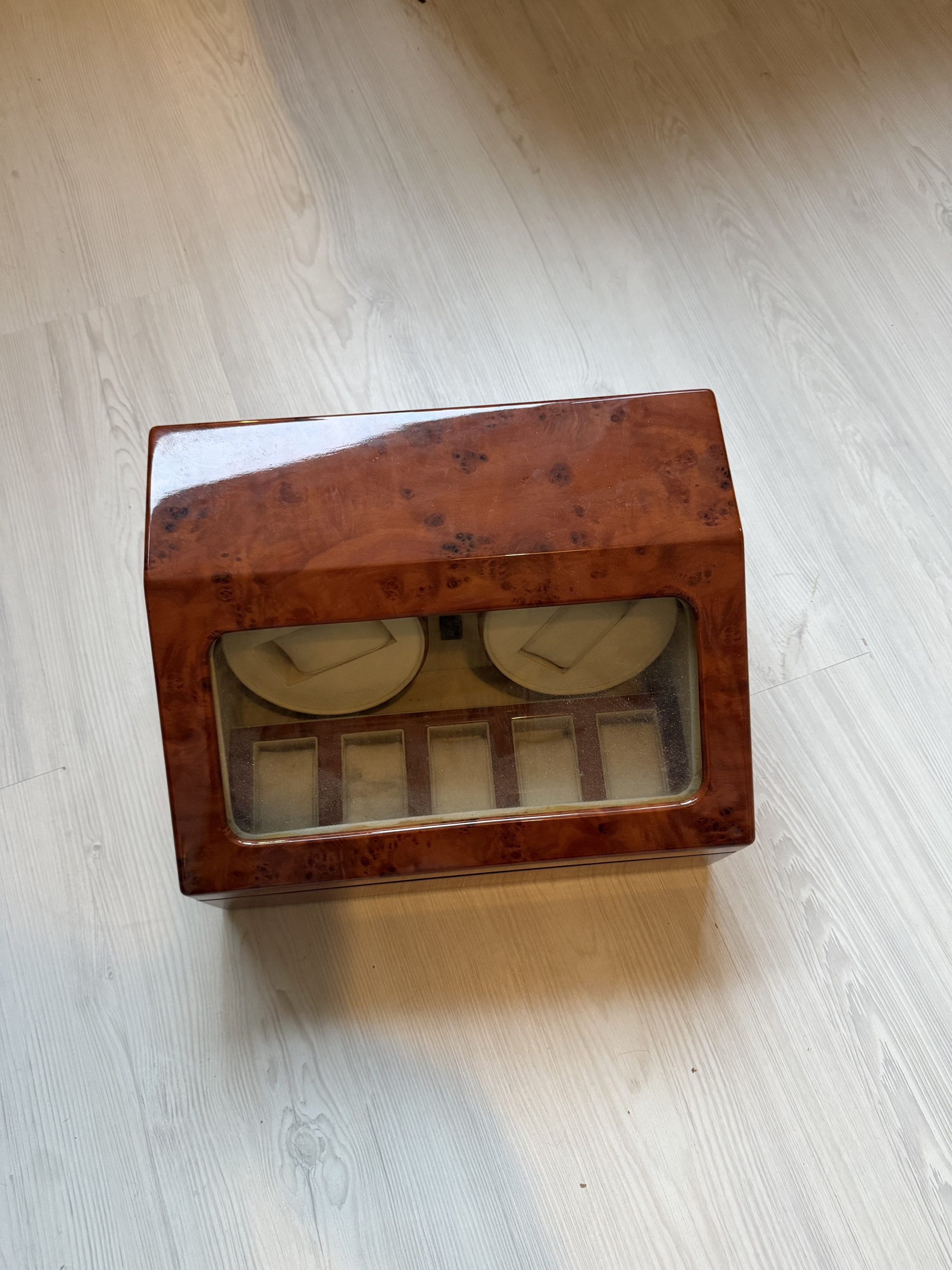 Mooi houten watchwinder-display voor 2 automatische horloges met daaronder ruimte voor 5 extra horloges of accessoires. De buitenkant heeft een glanzende houtfineerlook en het deksel heeft een raam wat ooo defect ia.