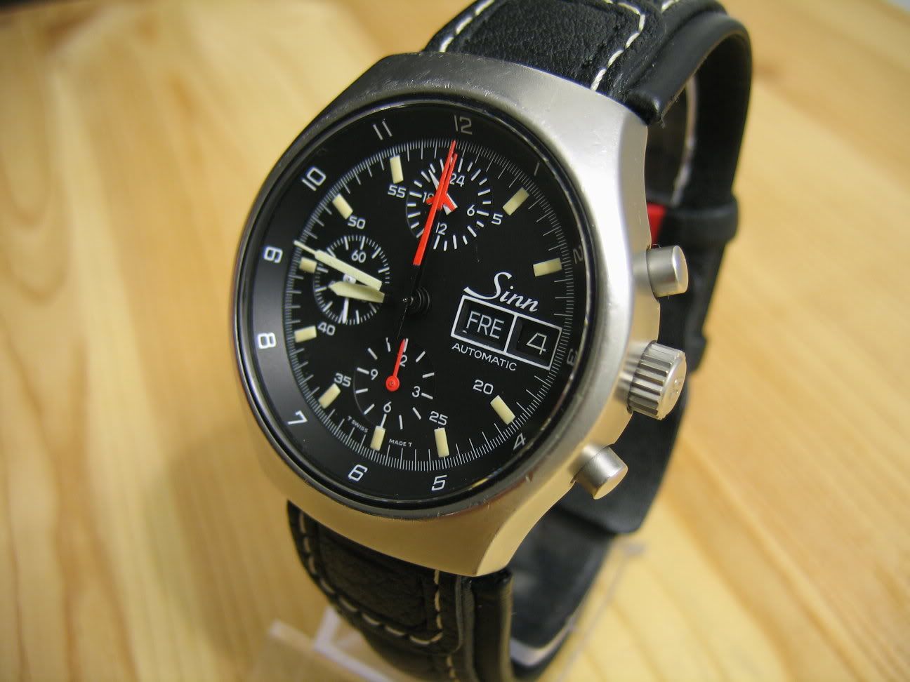 The movement is a slightly modified Lemania 5100. Yes, it is a true 5100, not a 5012 nor a 1340. The obvious change is that Sinn deleted the 24-hour register at 12 o’clock. This suggests that the watch might not have been intended for military use, as does the non screw-down crown, but everything else about the watch suggests otherwise.