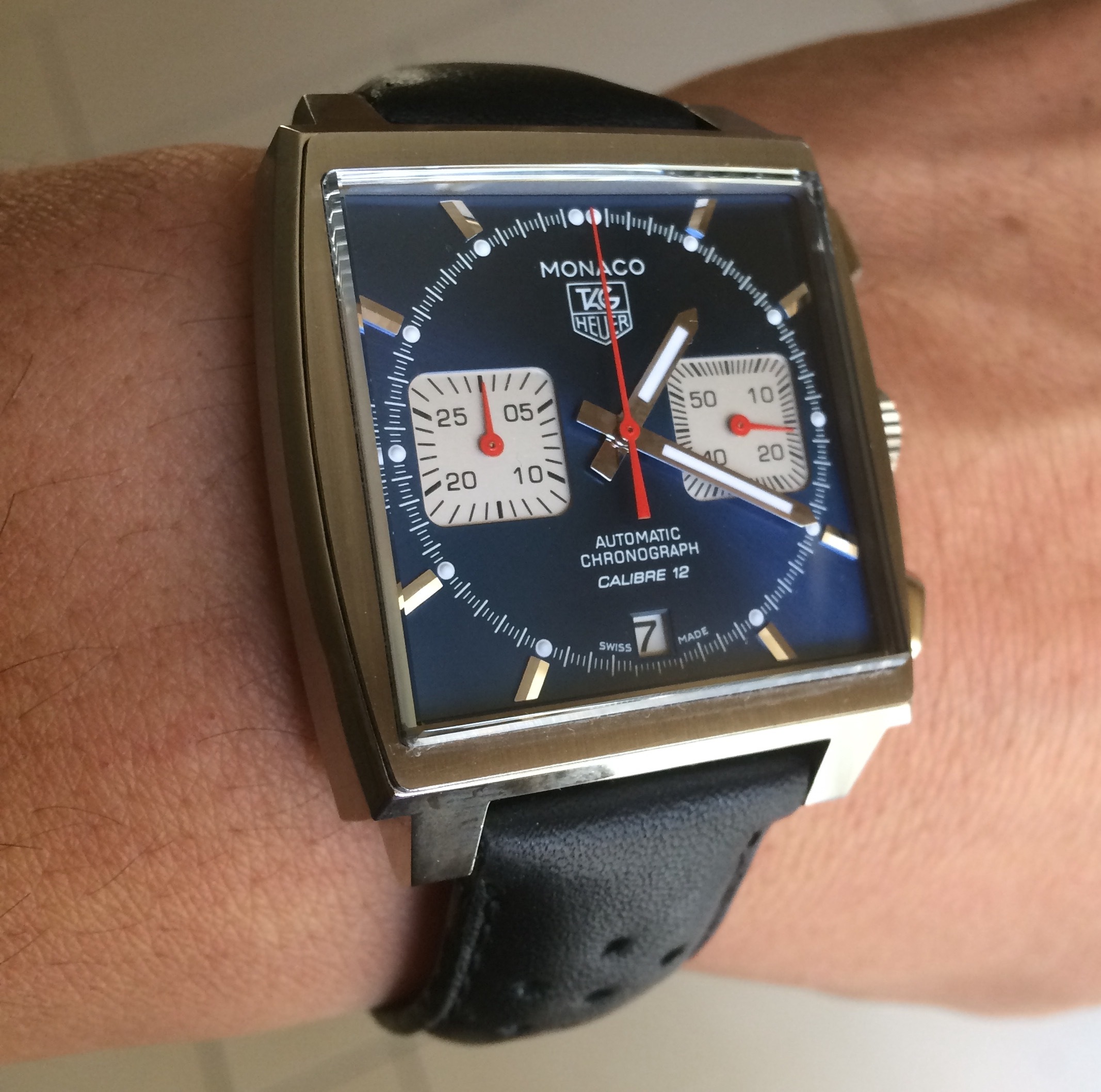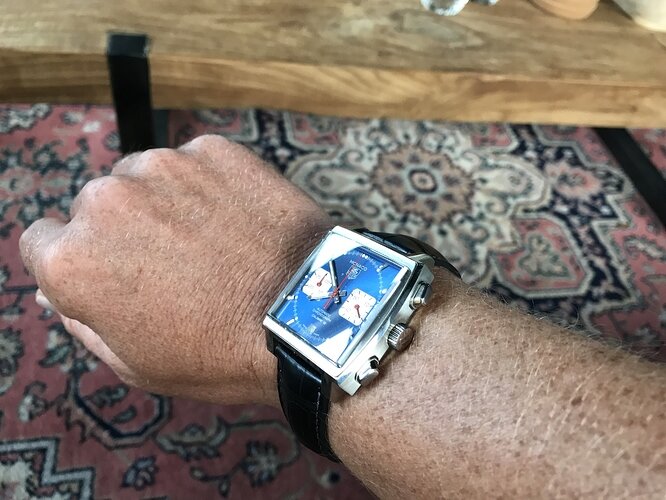 Hij is (en draagt) inderdaad veel groter dan die 39mm doen vermoeden. Ik heb 19cm polsen en heb oa Panerai’s van 44mm gedragen maar deze is, zeker door de kastdikte, eerder 42/43 imo. Dit zeg ik puur in vergelijking met dus bv een PAM. Dikte is denk ik soms nog maatgevender dan puur de diameter en dat bewijst de Monaco heel goed. Sommigen vinden hem te dik in verhouding tot de diameter maar (en ik ben een zeikerd neem dat van me aan) ik vind hem dus gewoon wel goed in verhouding. Heerlijke, enigszins aanwezig maar zeker geen Panerai-achtig horloge. Voor mij precies goed.