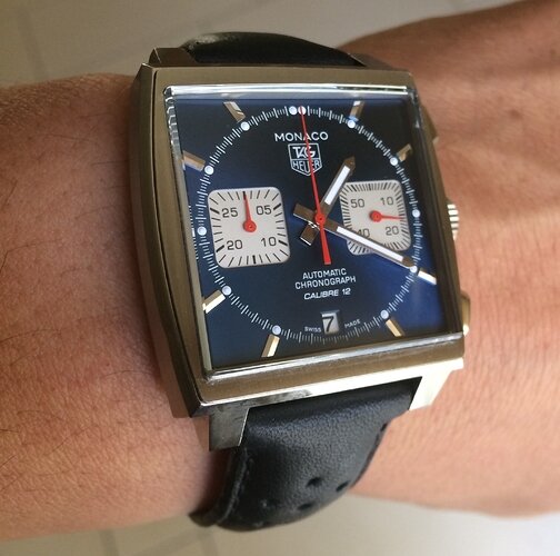 Vierkante horloges (geen cushion case) dragen/ogen in het algemeen groter dan de diameter doet vermoeten. Dat is niet specifiek iets van de monaco. Dat heb ik bij al mn vierkante horloges gemerkt.