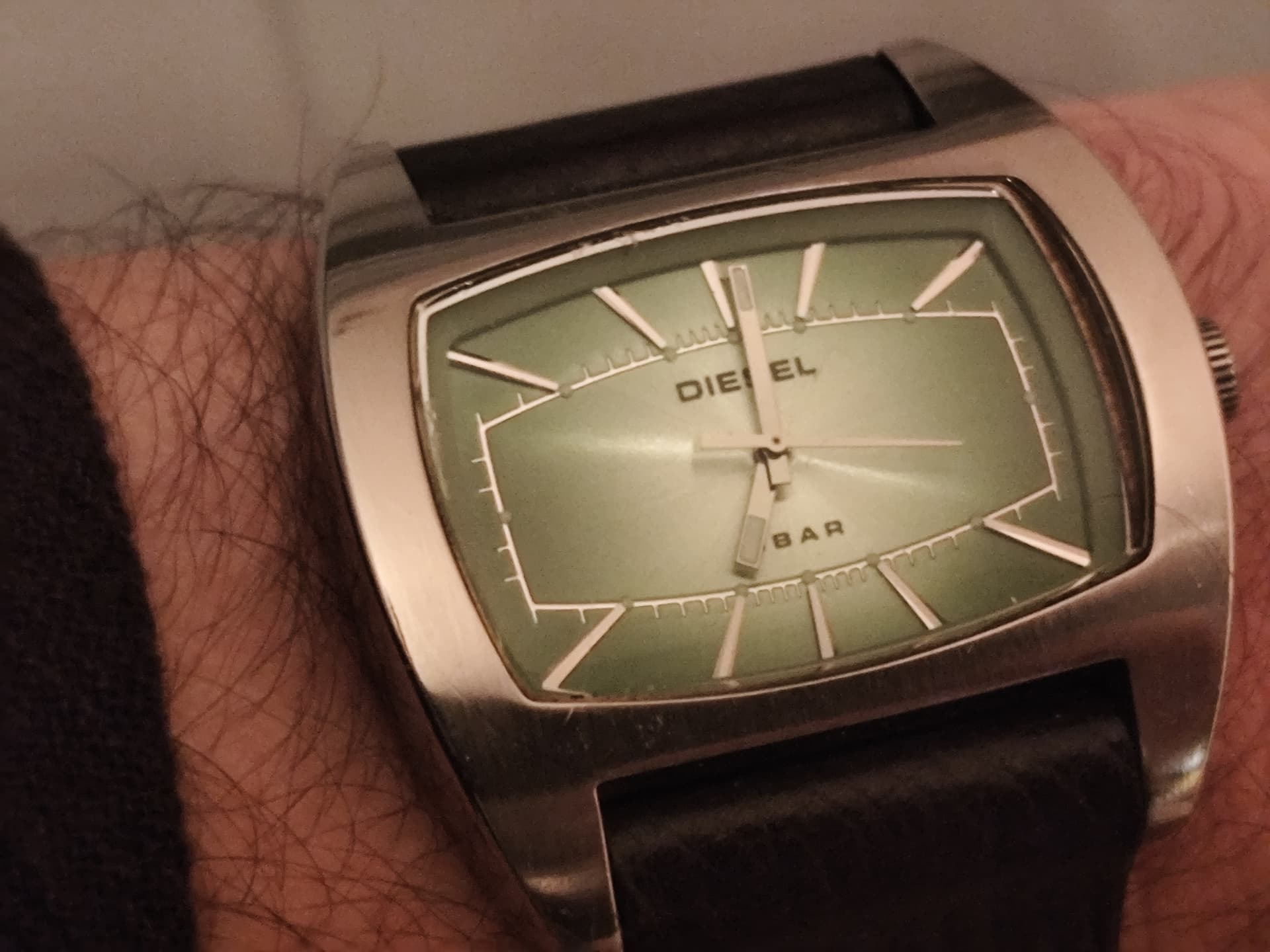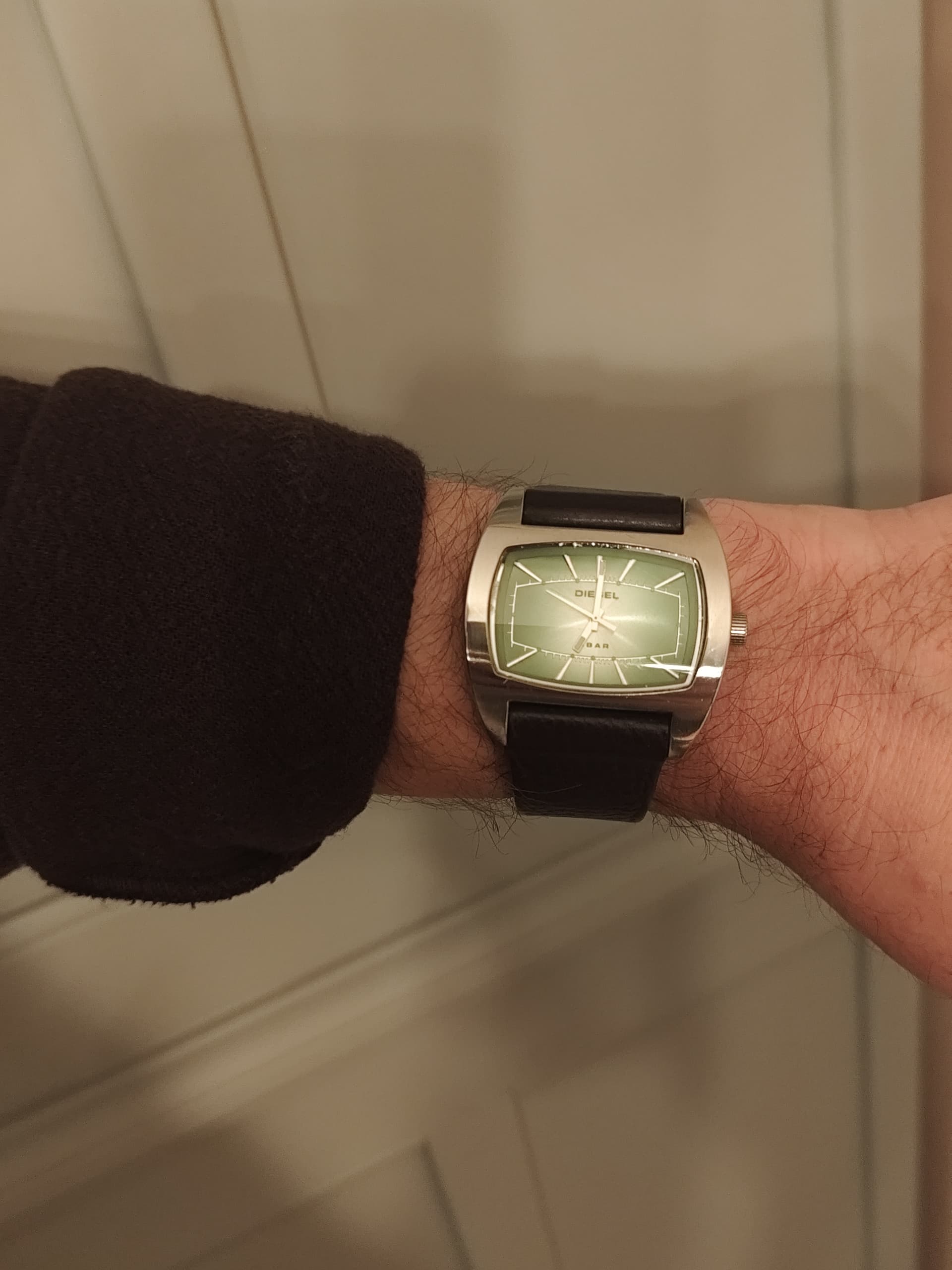 Dus ik naar Vinted. De eerste de beste Diesel van 15 euro gevonden die erop leek, wél met dat coole logo achterop. Af weten te dingen naar 10 hele Euro’s en bij aankomst van het pakket meteen een nieuwe batterij geplaatst, een 5-sterren review achtergelaten bij de verkoper, en toen zielsgelukkig 353 wristshots gemaakt om er pas vandaag achter te komen dat dat allemaal nog tijdens de Zomertijd moet zijn geweest.