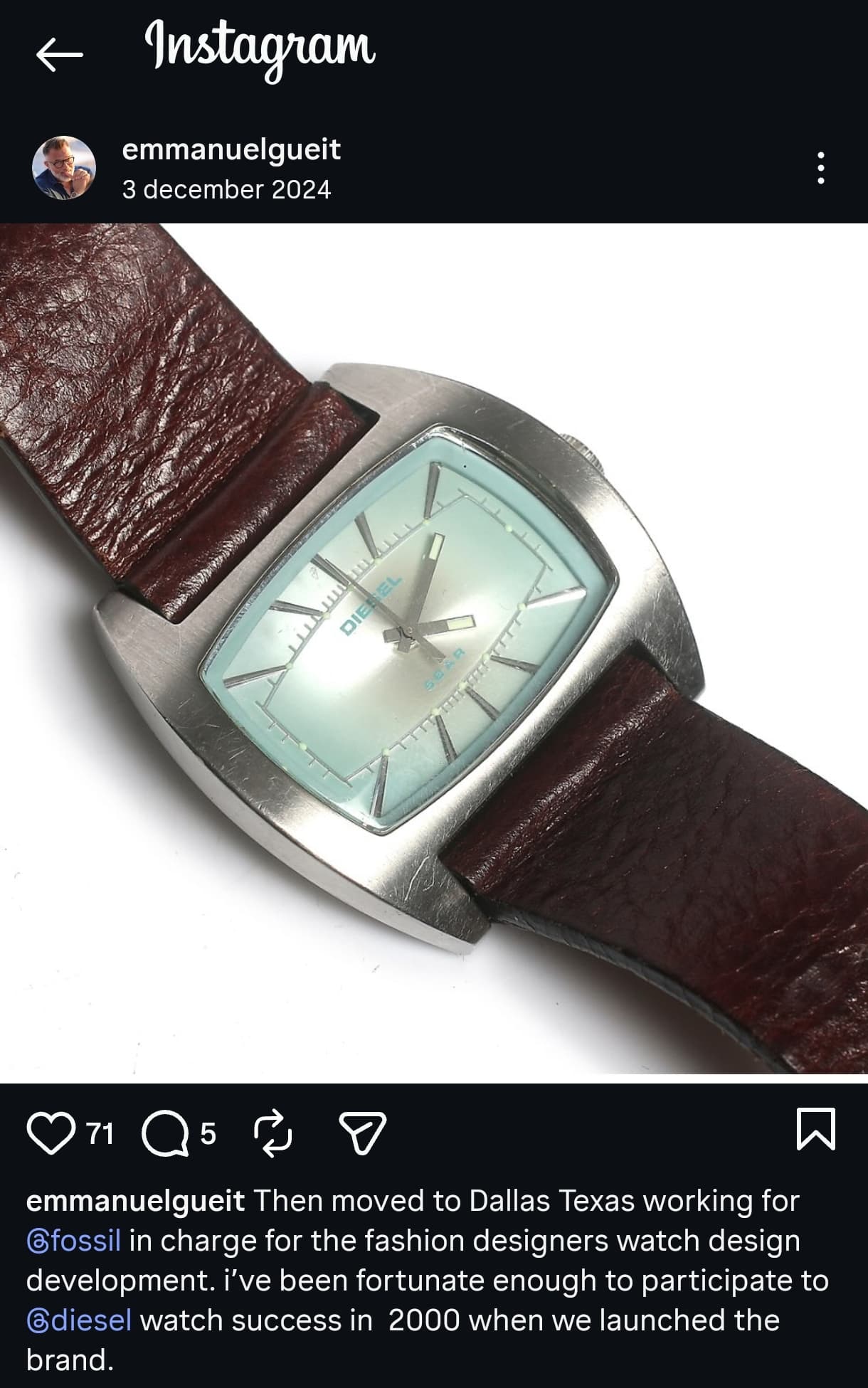 Er bestonden al Diesel horloges, maar doordat Fossil erbij betrokken raakte, werd het huge… Emmanuel Gueit werkt in dienst van Fossil om Diesel’s designafdeling te runnen, hij noemt de launch datum in 2000.