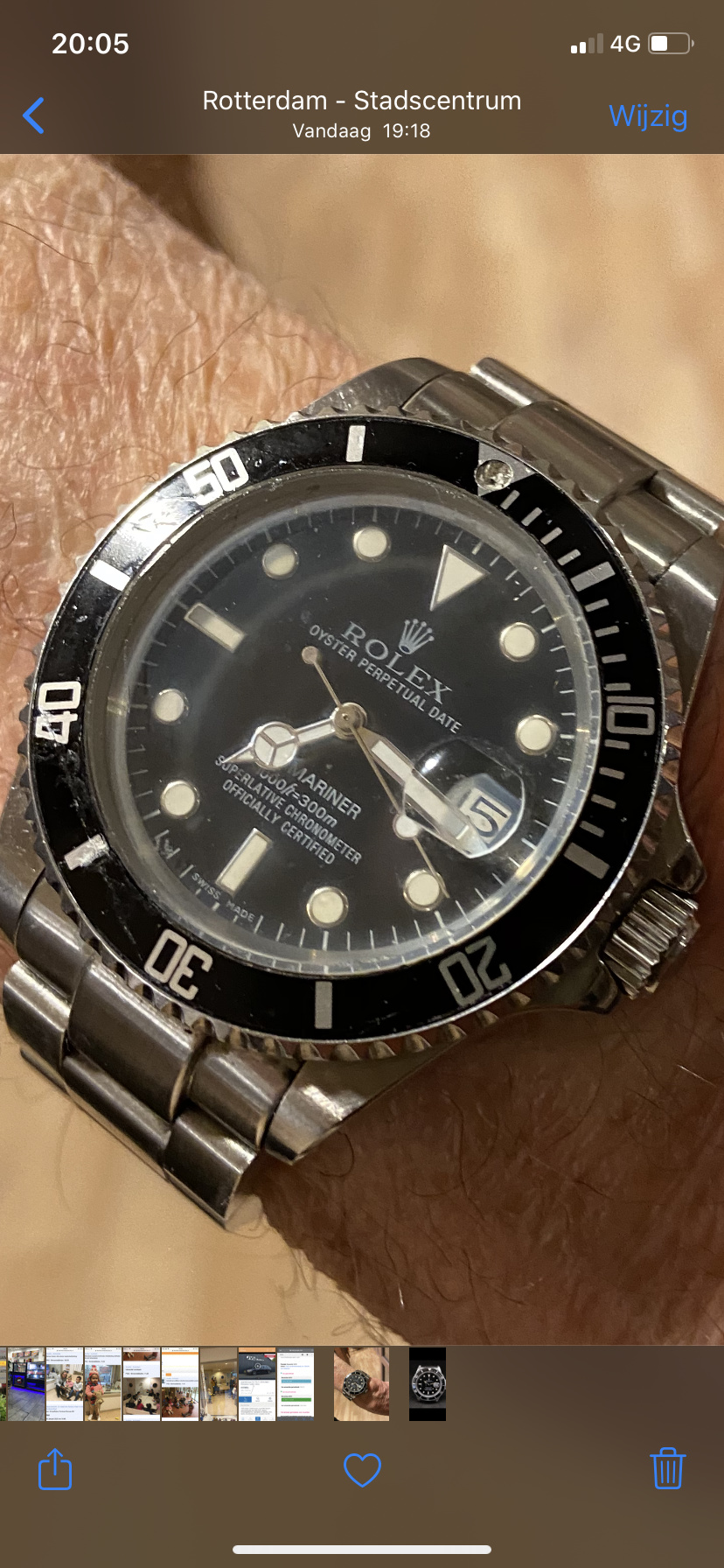 Aangezien de foto gemaakt is in het centrum van R’dam zou ik zeggen ga met die beste man naar een AD of gerenommeerde juwelier, laten hem bekijken en taxeren, dan weet je het gelijk, is de meest eerlijke manier, en wellicht houdt de beste man nog een leuk zakcentje voor zijn oude dag eraan over