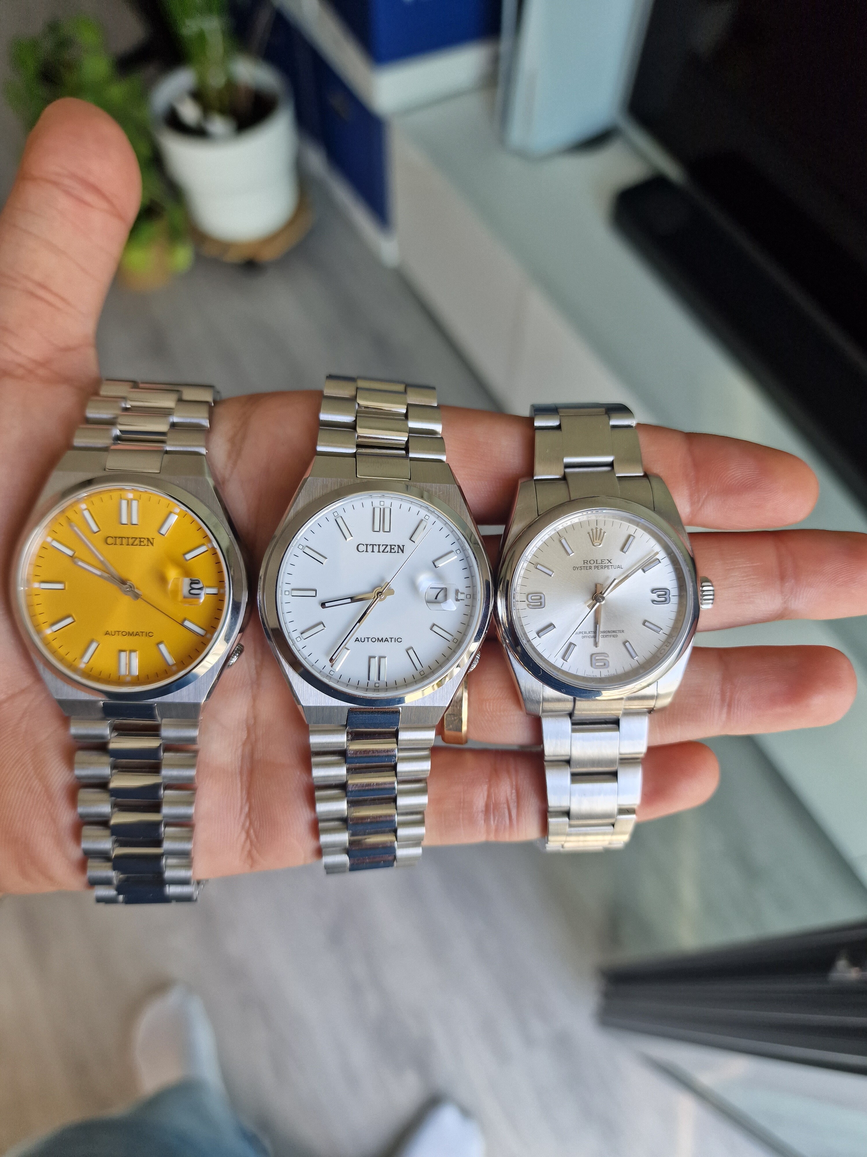 Van een mede forumlid werd mij gevraagd om de witte te vergelijken met de oyster perpetual die ik heb. Hij had het idee dat de platen redelijk hetzelfde zijn. Ik kan er in principe redelijk kort over zijn. Hoewel ze wellicht voor iemand die geen interesse in horloges heeft bijna gelijk aan elkaar zijn, verschillen ze nogal van elkaar. De plaat van de rolex is zilver en sunburst, en de band voelt degelijker en wat zwaarder aan. De rolex is ook wat kleiner. Al moet ik wel zeggen dat de Citizen wat fijner draagt, misschien omdat het wat lichter is.