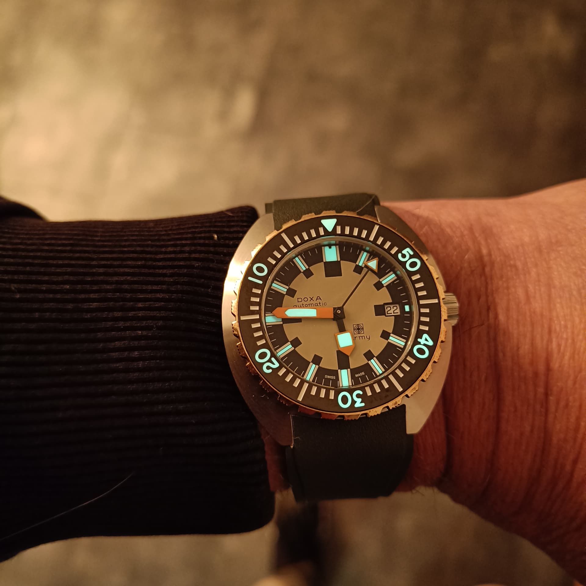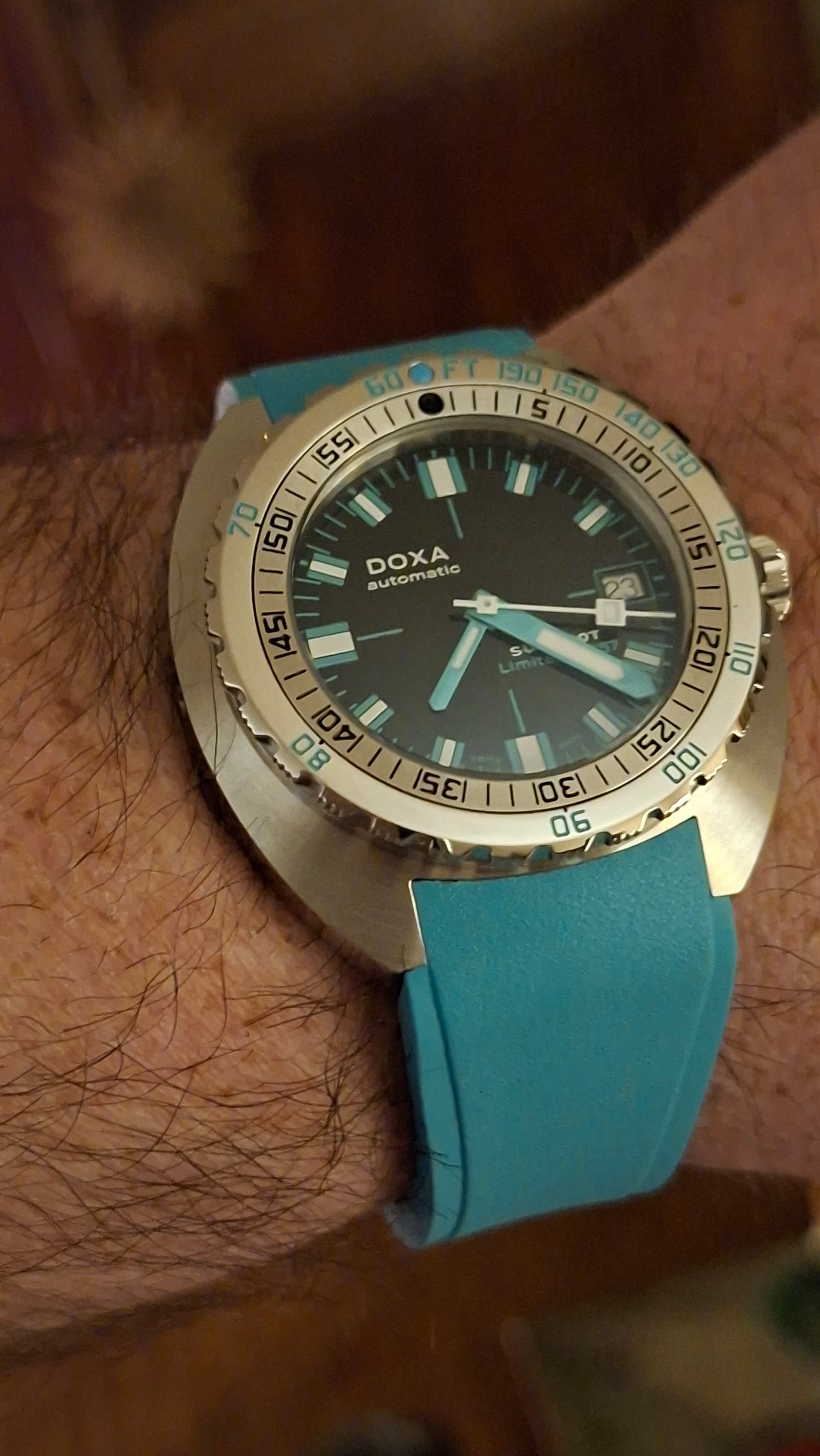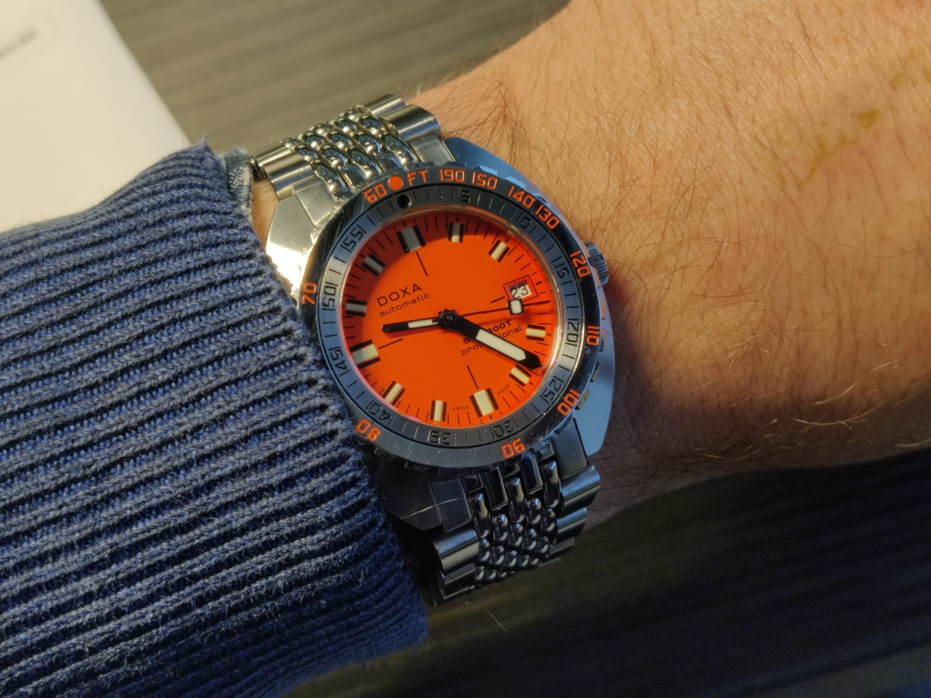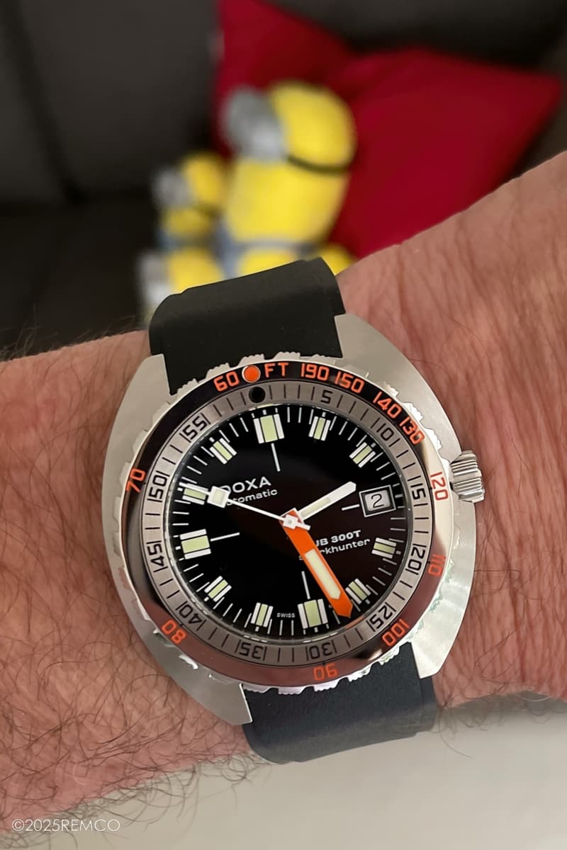 Ik kom hier alvast even afscheid nemen want mijn 300T sharkhunter is overgenomen door @Louis. Hij zal zich binnenkort hier wel melden als een blij ei, met deze leuke en eigenwijze Doxa om de pols …