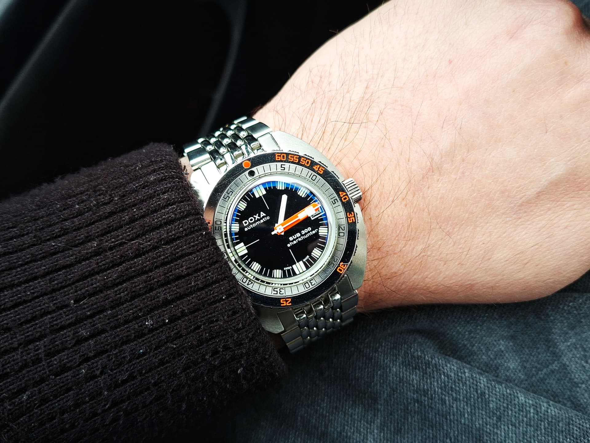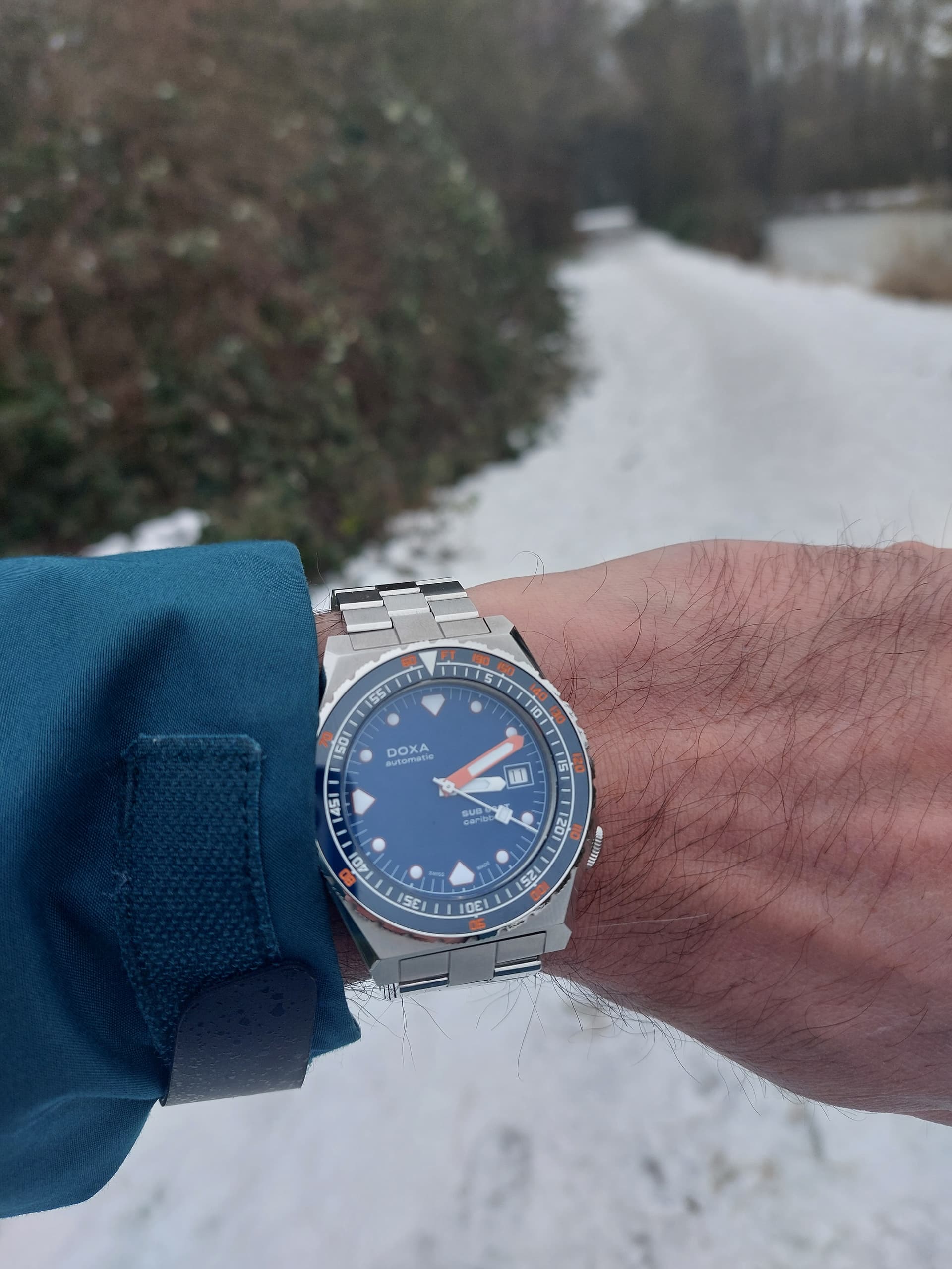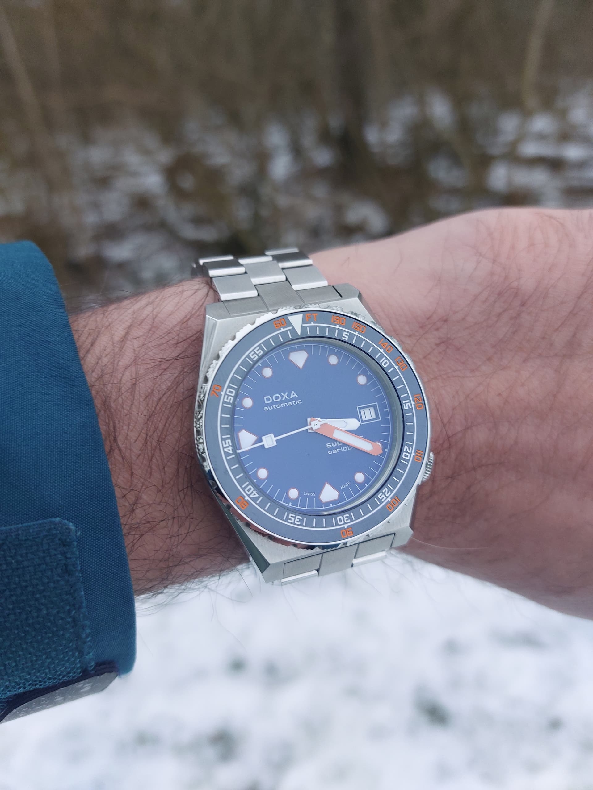 Vandaag van forumlid JohnD deze waanzinnige Doxa overgenomen. Mijn eerste Zwitserse uurwerk en wat een klapper zeg. Ik ben niet zo’n duikhorlogeliefhebber, maar deze met zijn blauwe plaat en blauwe keramische bezel met oranje accenten is echt geniaal.