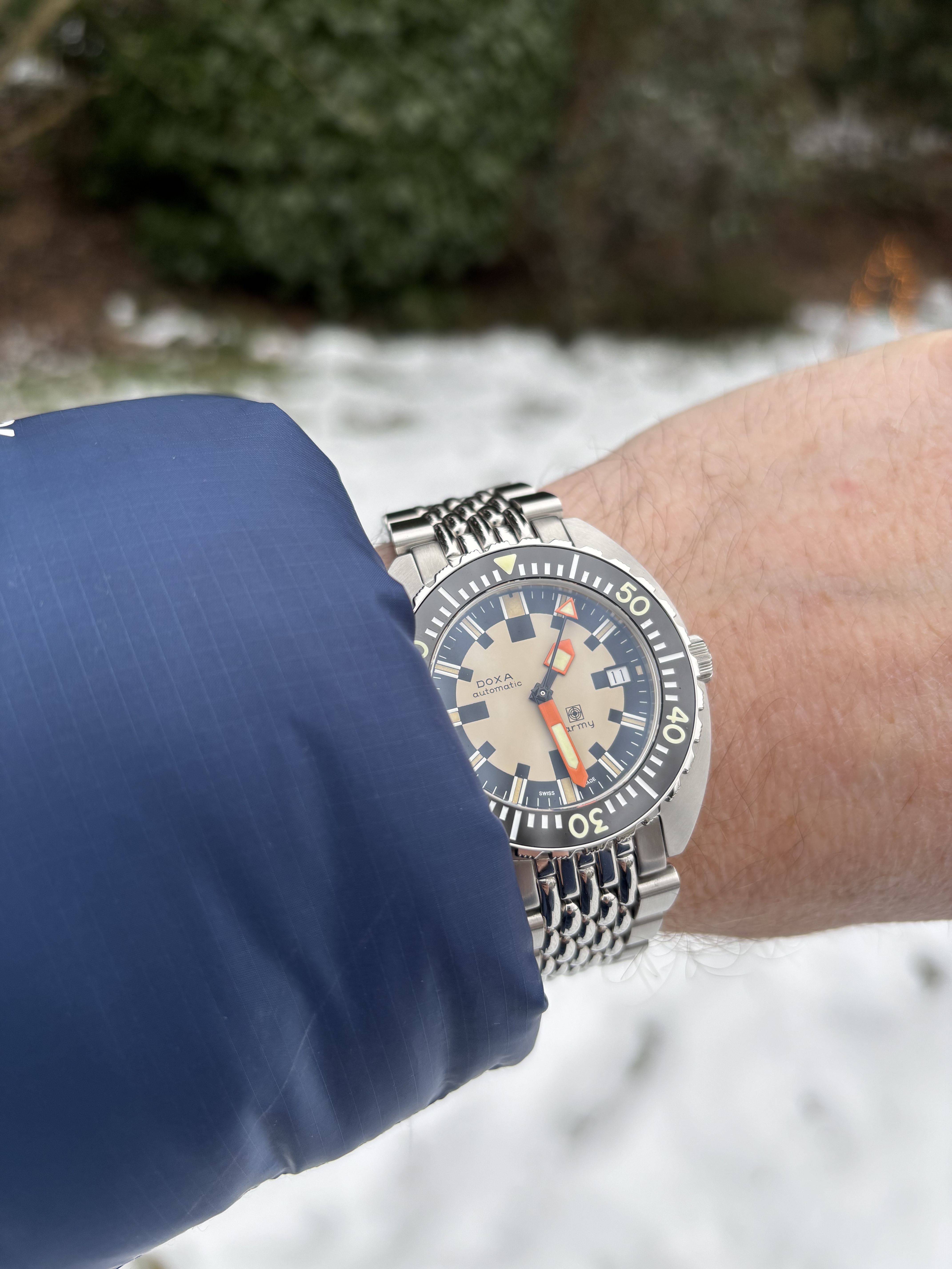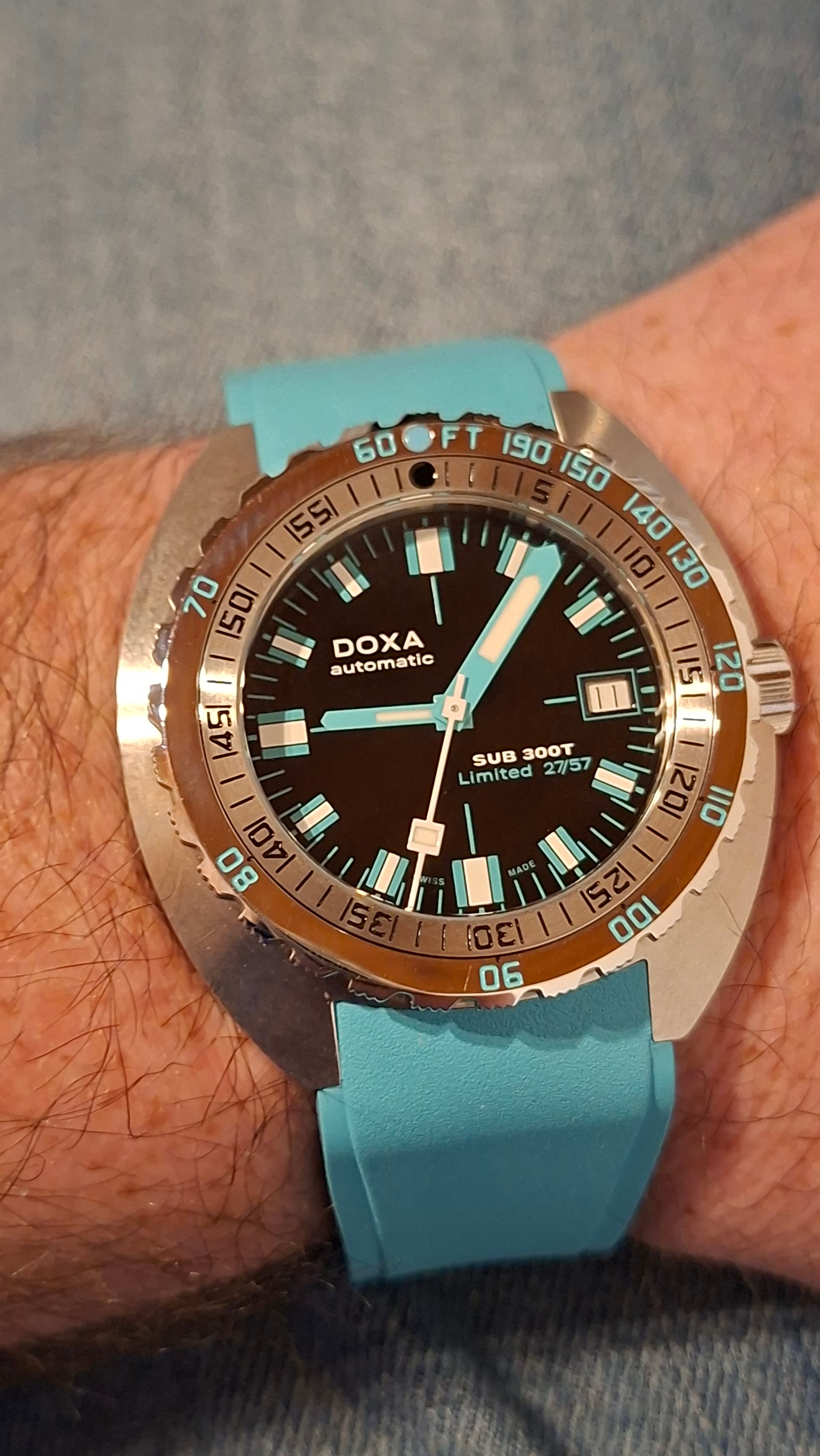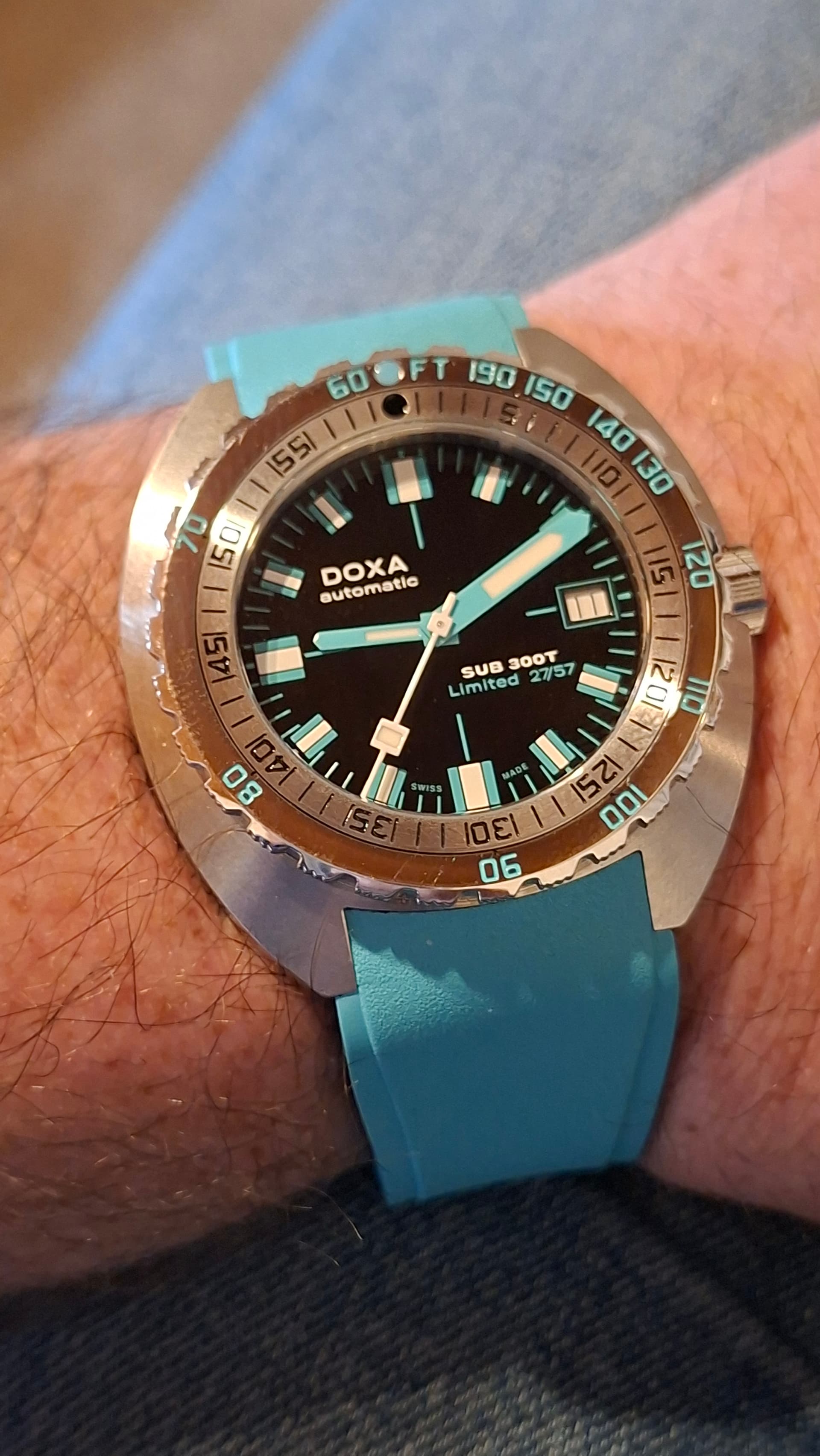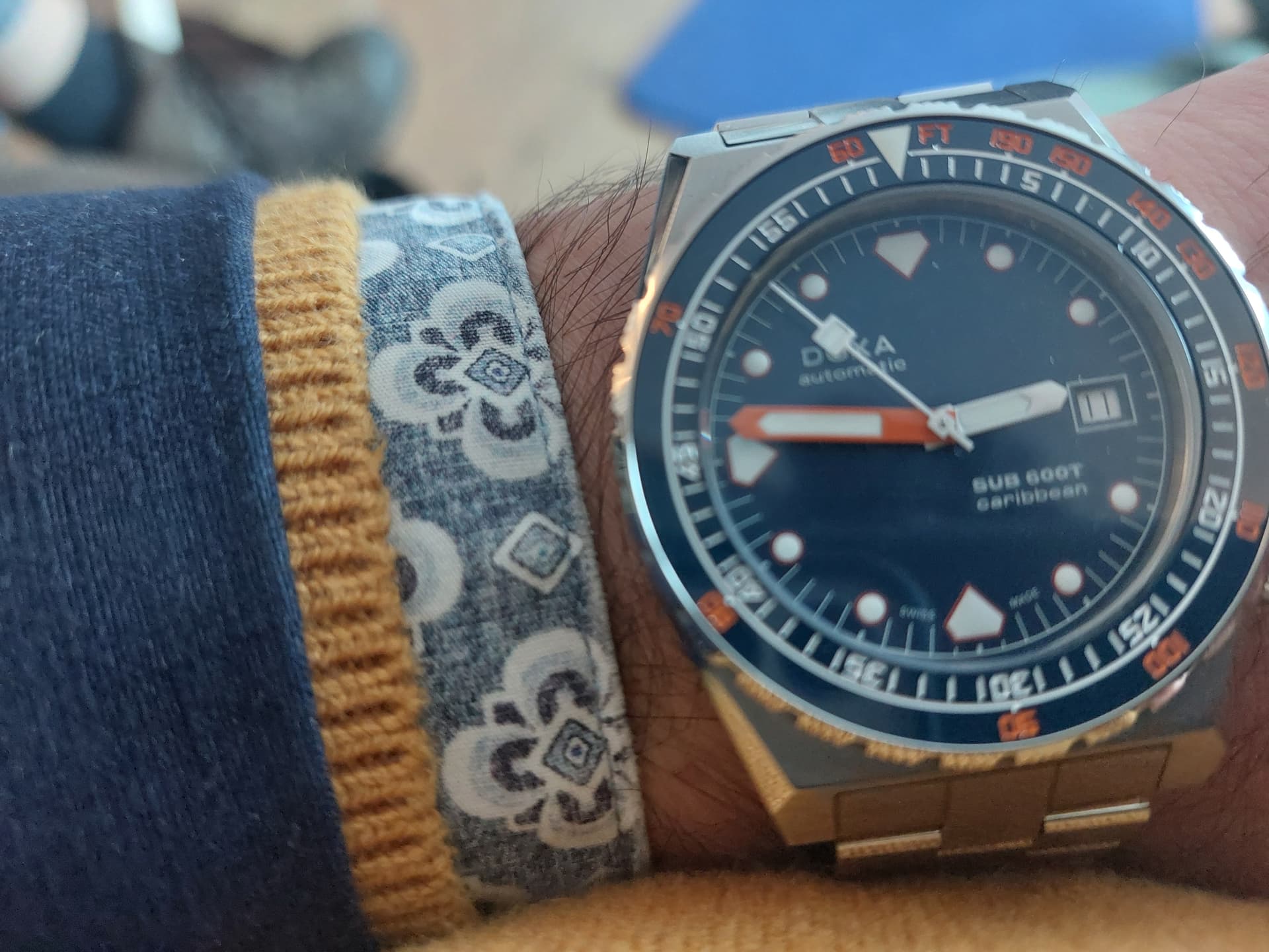 Vandaag van forumlid JohnD deze waanzinnige Doxa overgenomen. Mijn eerste Zwitserse uurwerk en wat een klapper zeg. Ik ben niet zo’n duikhorlogeliefhebber, maar deze met zijn blauwe plaat en blauwe keramische bezel met oranje accenten is echt geniaal.