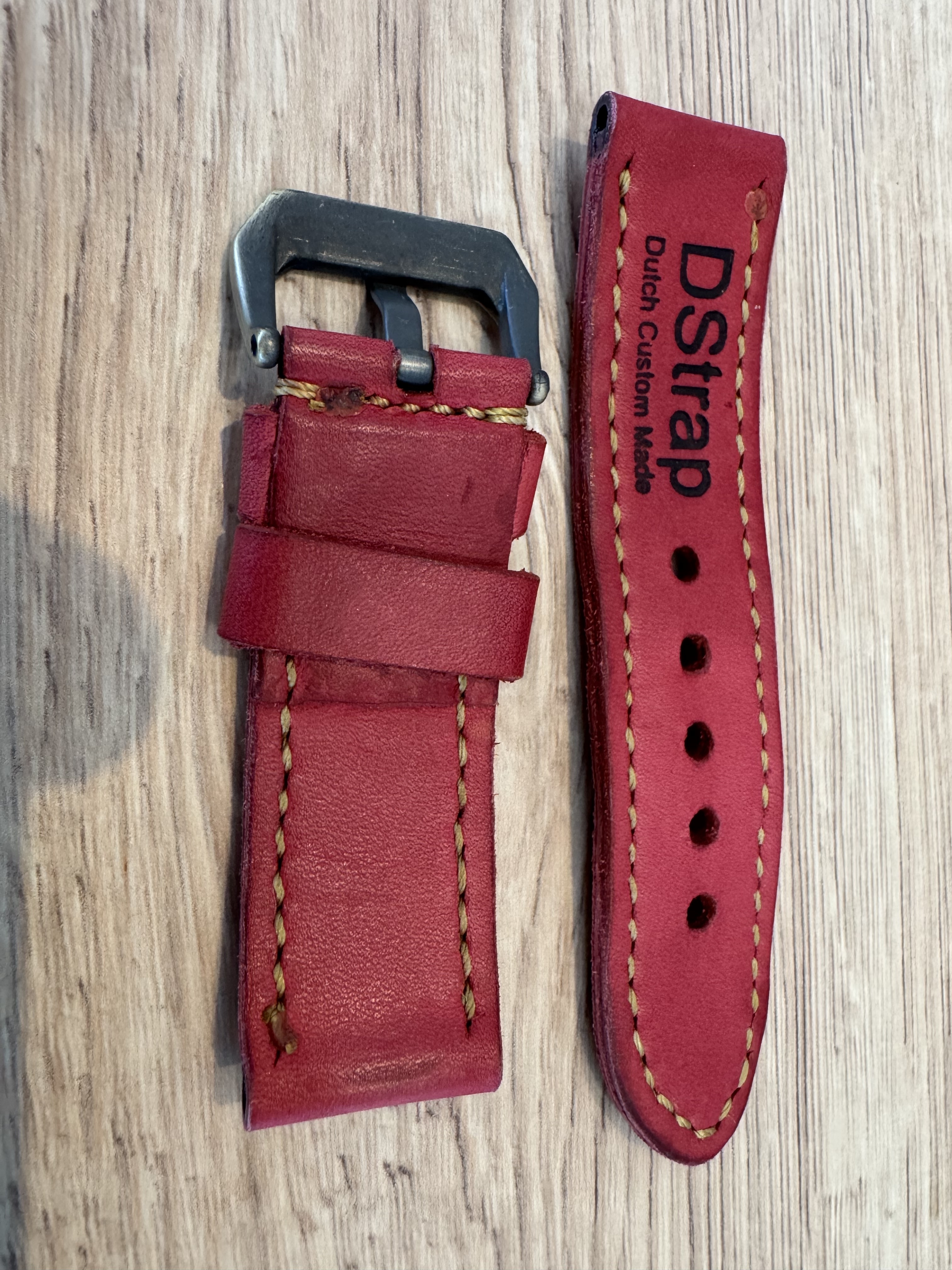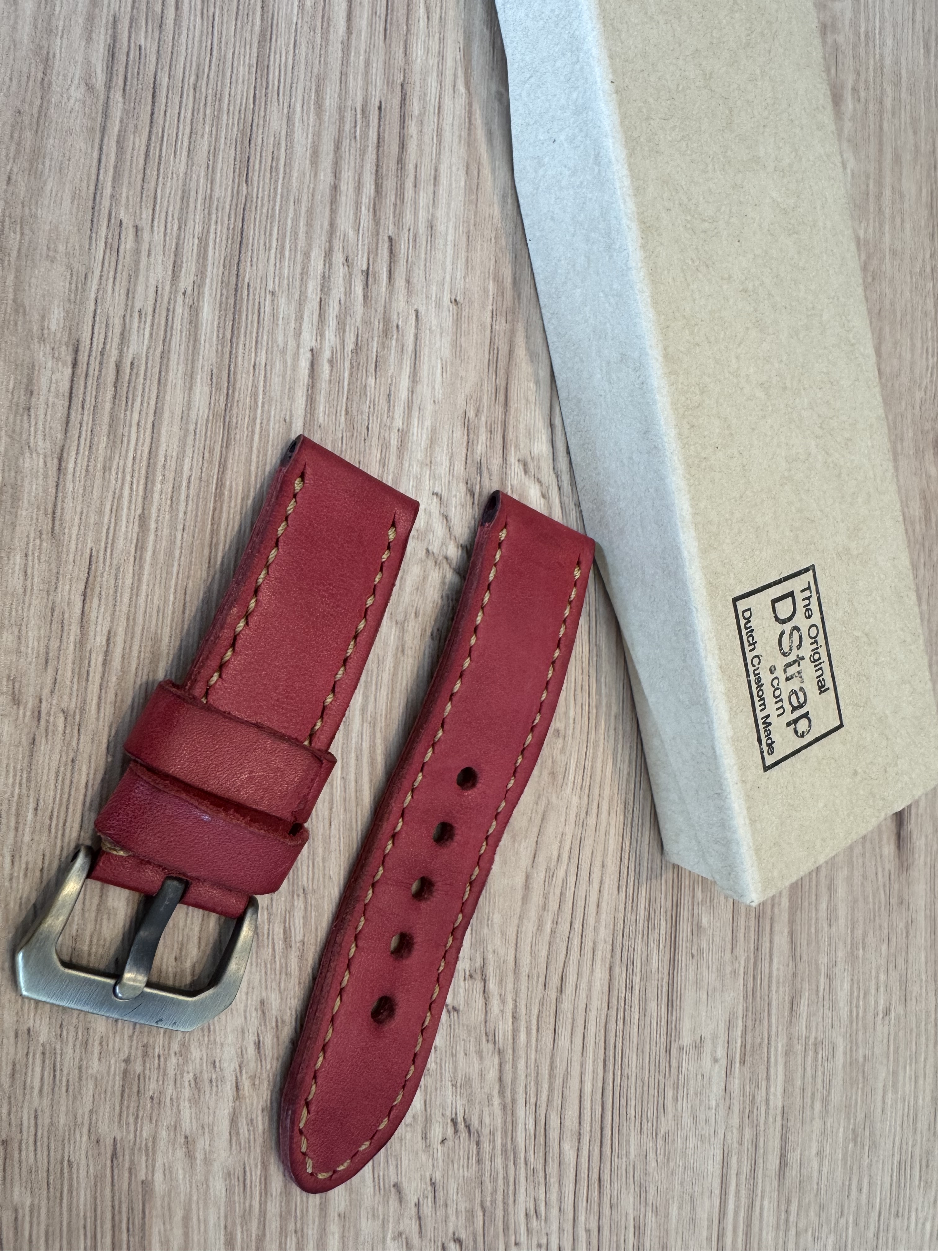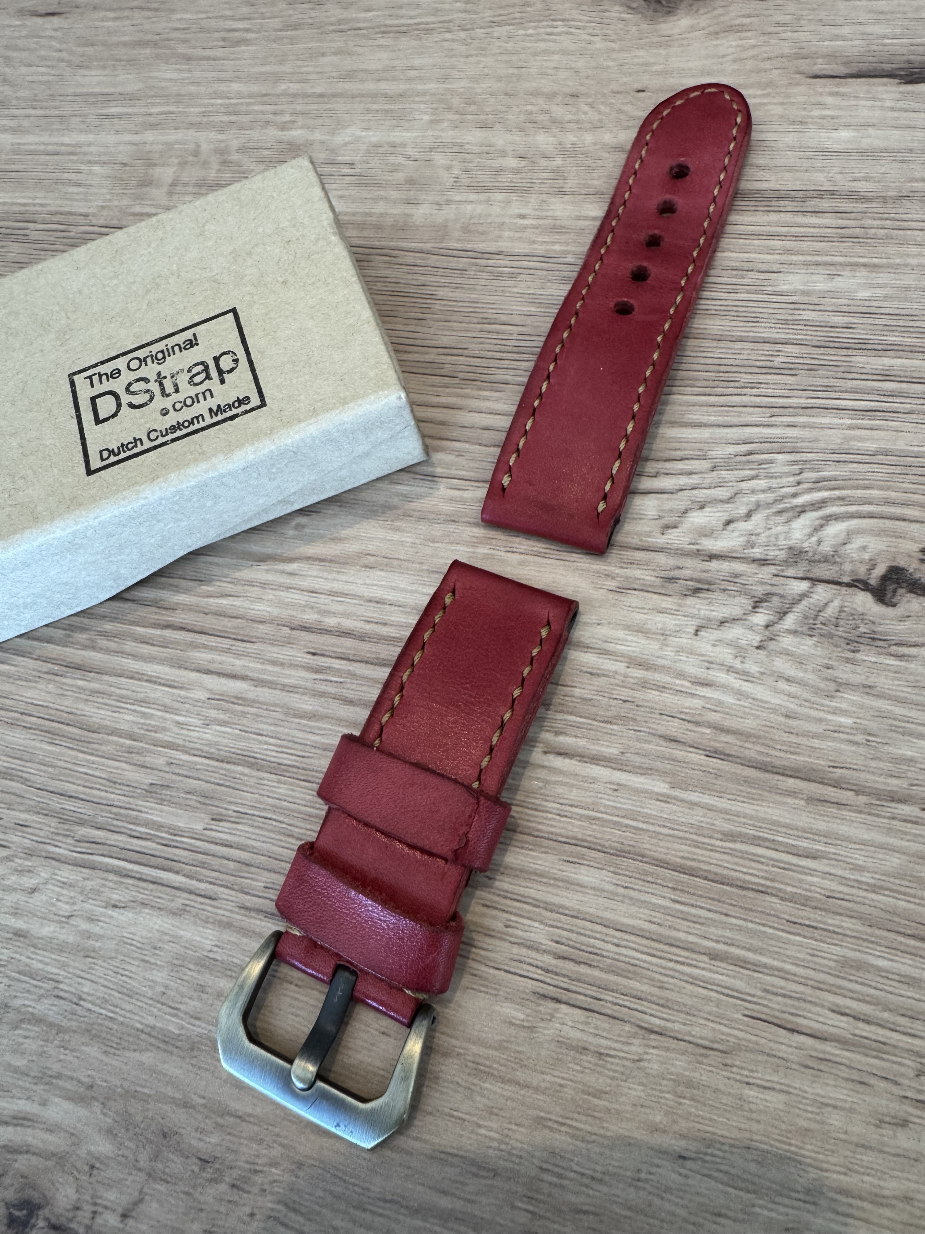 Omgedragen Dstrap, rood vintage leder. Band heeft de normale standaard lengte. Bronzen gesp. Compleet met Dstrap doosje. 24mm band aanzet.