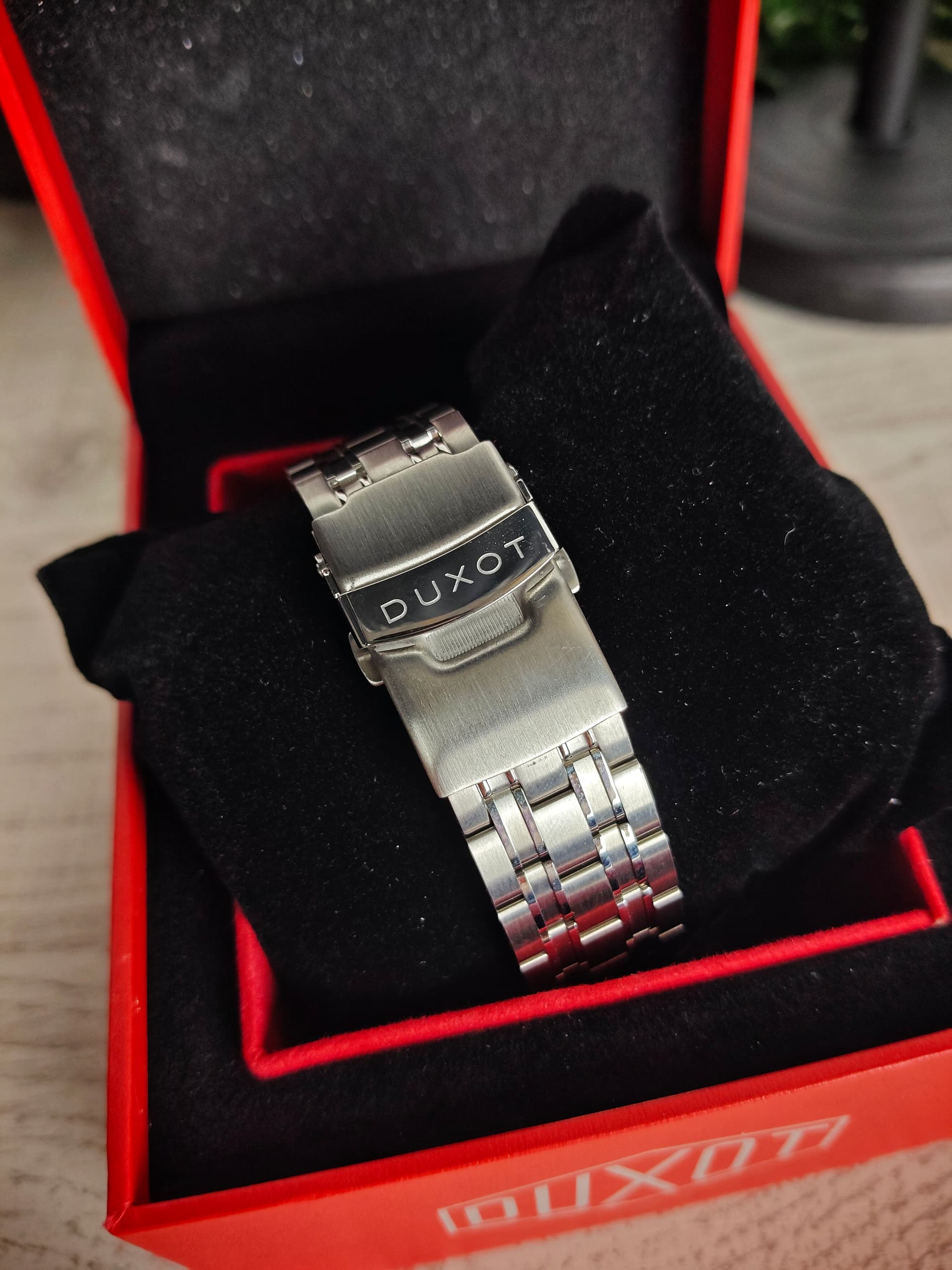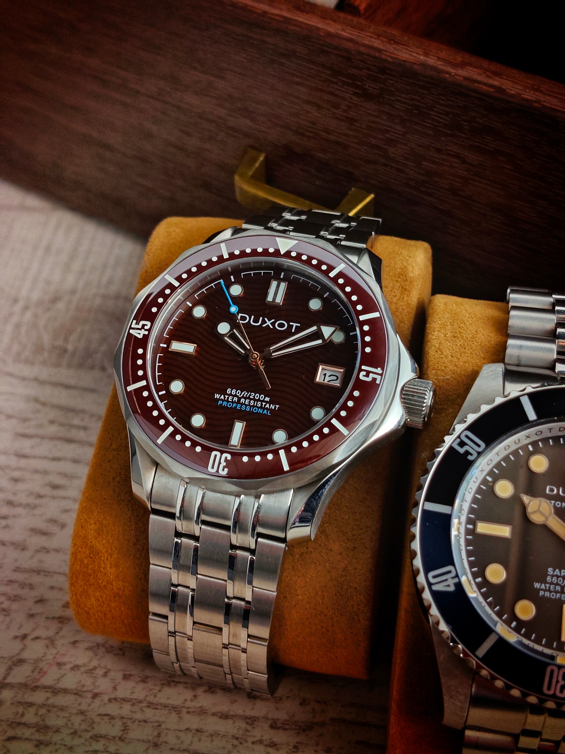 Duxot - Henri Diver Automatic in de kleur Deep Brown. Deze zeer weinig gedragen Duxot mag de collectie verlaten. De caseback sticker zit er nog op en ik kan aan het horloge heen beschadigingen of draagsporen ontdekken.