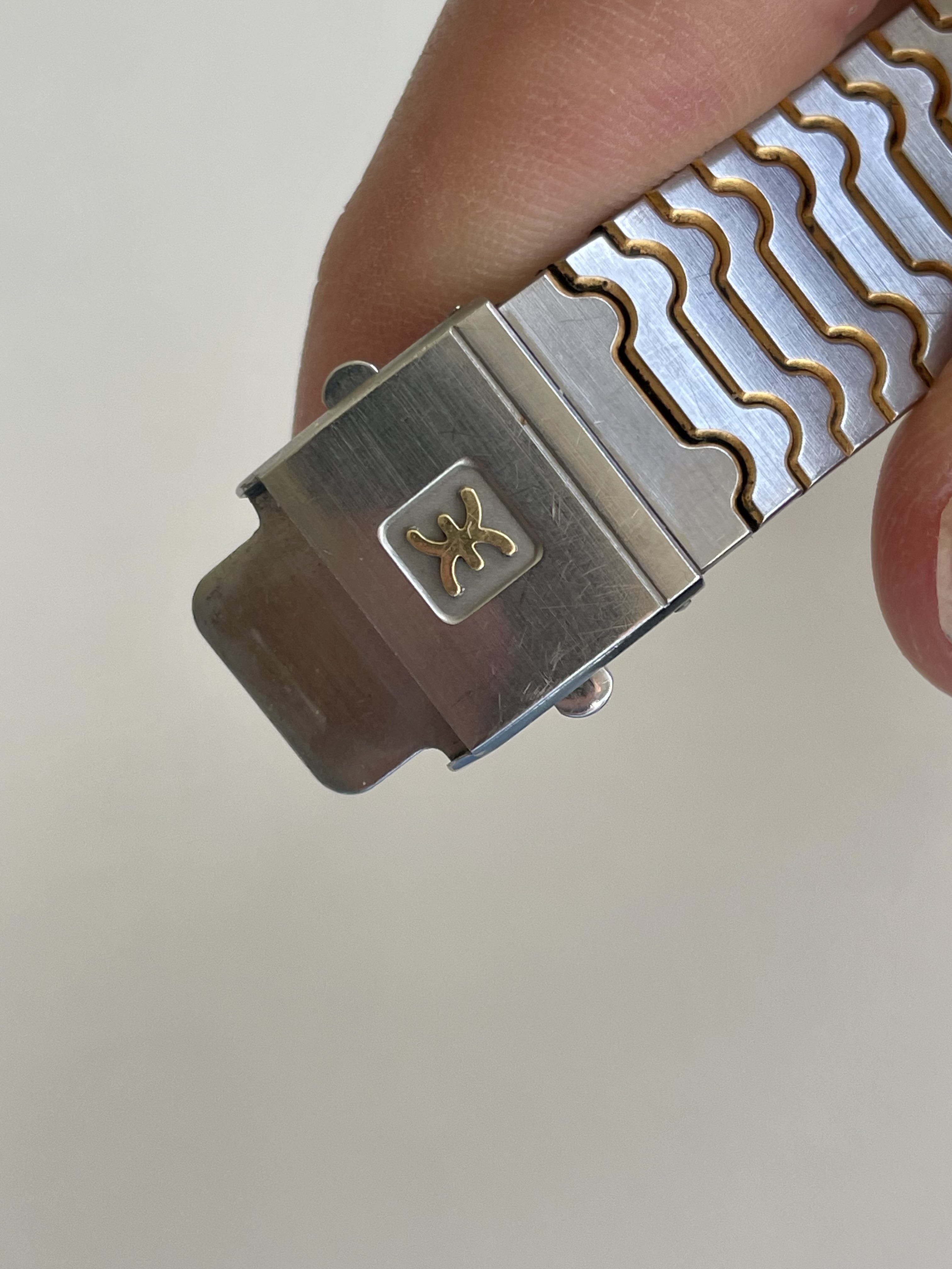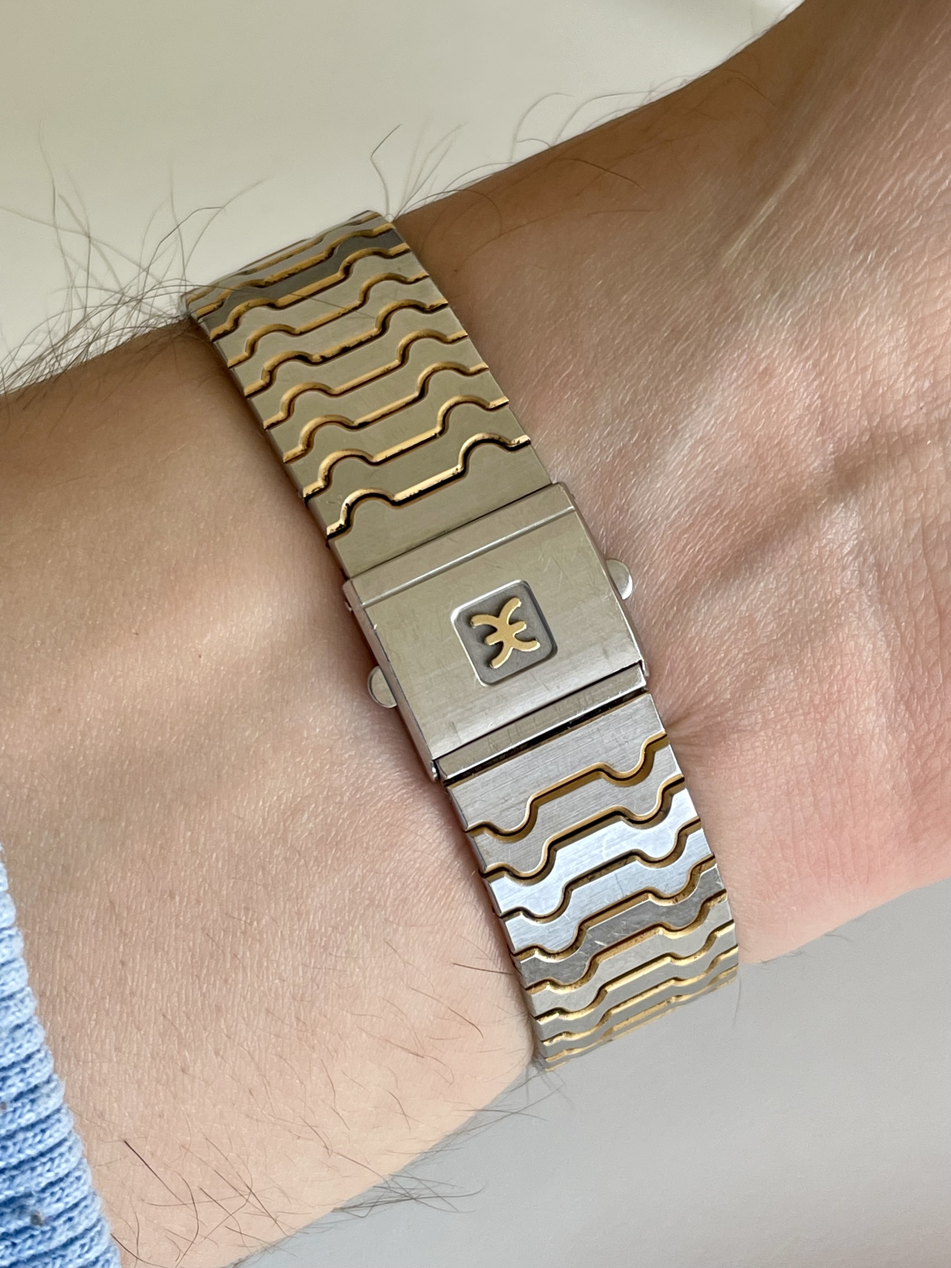 Conditie (krassen, werking etc): horloge verkeerd in goede vintage staat. Dit betekent dat er rondom krasjes zitten, maar het geheel nog de originele lijnen heeft en volledig functioneert zoals het hoort. Band is aan de korte kant en geschikt tot ong. 16.5cm.