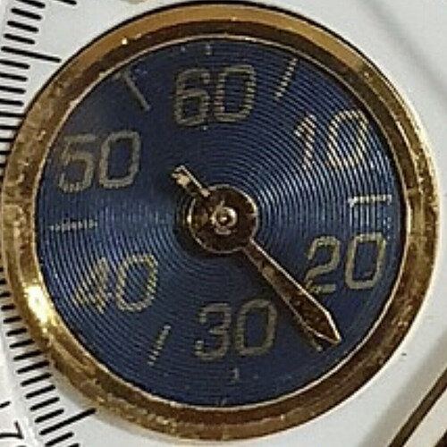 Rood: Er staan 3 seconde indices tussen de 5 en de onderste subdial en er staan er 2 tussen deze subdial en de 7.