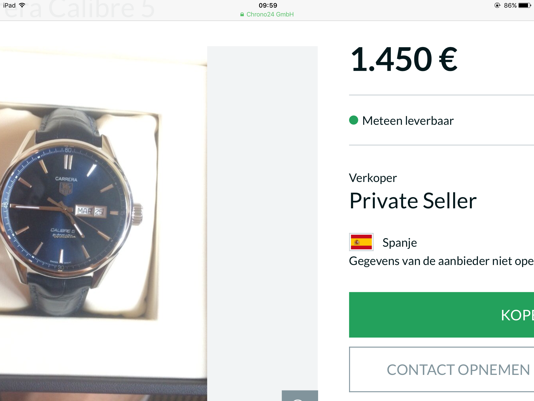 Nu kwam ik de volgende aanbieding tegen maar is dit te vertrouwen c.q. een echte? Voor mijn gevoel ziet alles er echt uit maar omdat de user geen recensies heeft twijfel ik. https://www.chrono24.nl/tagheuer/carrera-calibre-5--id6608813.htm