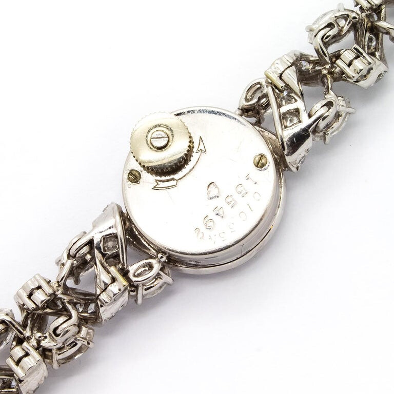 Hij is wel degelijk gestempeld zoals dat heet, in dit geval alleen met merk tekens. Ik ga er vanuit dat het hier gaat om een witgouden horloge (mogelijk zilver, maar dan is hij recent opgepoetst). Het is een backwinder, dus de opwindknop zit aan de achterkant, ik verwacht daarom een uurwerk van LeCoultre of European Watch Co. Ik ga er vooralsnog vanuit dat het een origineel horloge betreft. Ik ga even een paar boeken open trekken…