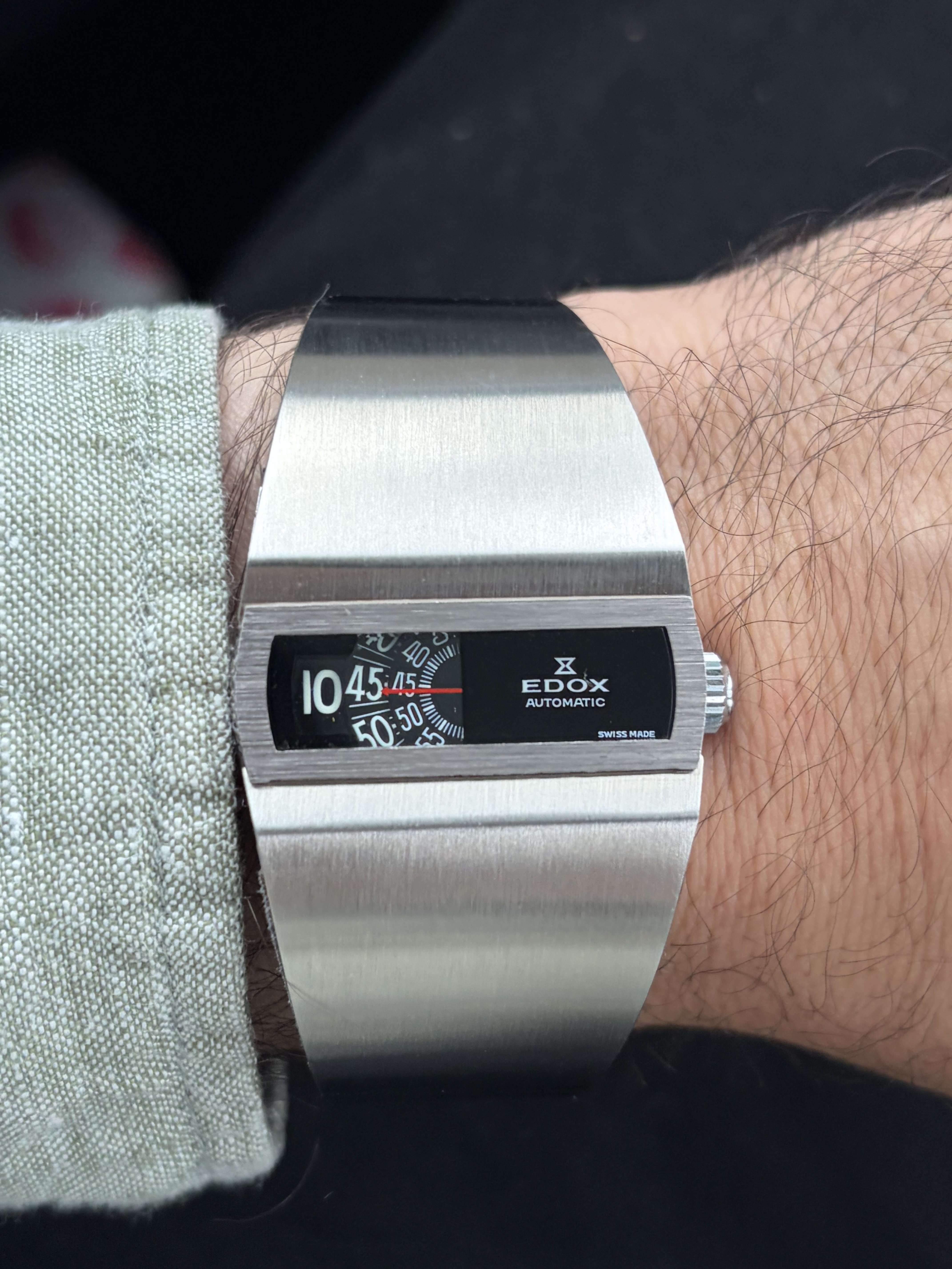 Omdat mijn Certina met stalen band bij de reparateur ligt, heb ik deze opgepikt in de buurt. Een Edox Les Vauberts 01655-3M-ARN, eens wat anders zo’n maanfase!
