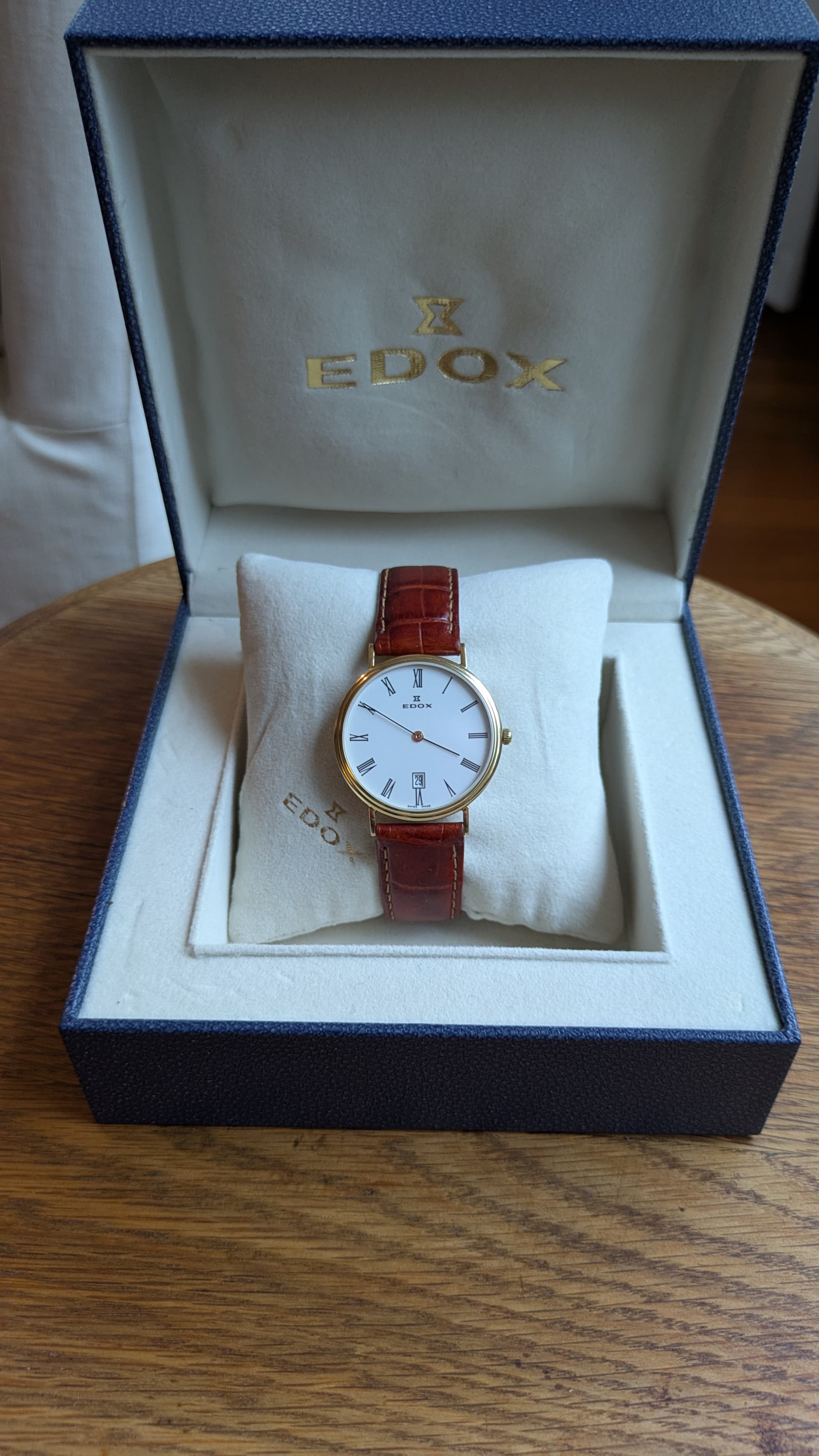 Het zou een Edox Les Genevez zijn maar online vinden we niet exact hetzelfde model. Het is een fullset dus mooi compleet. Hij wil het horloge graag verkopen en we zijn daarom op zoek naar een mooie waardering of adres waar we het kunnen aanbieden. Ik overweeg het hier op het forum aan te bieden maar twijfelen over de vraagprijs.