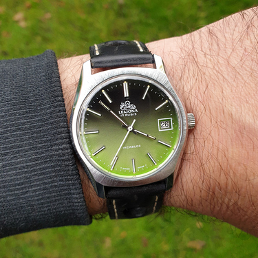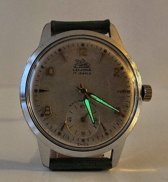 Van het resultaat werd ik wel blij. Een netjes uitziend typisch jaren 60 klassiek vintage horloge. Vrij klein, zoals bijna alle horloges uit die tijd tegenwoordig klein lijken ten opzichte van de ‘moderne’ populaire polshamburgers. Echter, met 36mm ziet het er op mijn smalle pols toch niet uit of ik met een dameshorloge rondloop. Tevreden dus met mijn tweede Leijona in de collectie. Nog een laatste leuk detail: Wijzerplaat configuratie is 2-4-(6)-8-10-12!