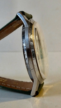 Daarna moest nog het kastje worden schoon gemaakt en een beetje opgepoetst. Net te heftig, geen echt polijstwerk, want het is van verchroomd base metal en voor je het weet heb je dan een koperkleurig kastje met afgeronde hoekjes. Het bleek erg mee te vallen. Een kwartiertje in de Ultrasone met Dasty, goed drogen, daarna poetsen met Uniepoets. Het uiteindelijke resultaat was aanvaardbaar voor wat je van een ca. 60 jaar oud gedragen horloge mag verwachten. De caseback werd op mijn mini Unimat1 poets/draaibankje weer netjes, vrijwel zonder krassen of butsen. Het glaasje vervangen was vervolgens ook een makkie, ik had de goede maat in voorraad en met de Bergeon glasafnemer (in dit geval eigenlijk glasopzetter) zat er in no time een mooi nieuw helder sexy plexy glaasje op de kast.