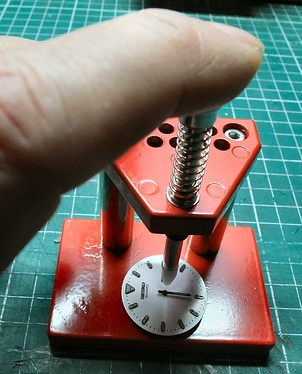 De wijzertjes ondersteboven met de uiteinden op twee stukjes binnenstebuiten opgerolde crèpe tape vastgemaakt en met een heel klein penseeltje op de achterkant glow in the dark verf aangebracht. Een uurtje laten drogen en hard laten worden. Vervolgens de uren- minuten- en seconden wijzers weer op het horloge vastgedrukt met zo’n klein rood drukpersje waarmee je heel precies en ook zonder de rest van de plaat te raken de wijzers weer kan vastzetten. Geen topkwaliteit, gewoon een simpel ding van een paar dollar van Ome Ali, maar het werkt prima, net als die koevoetjes van de zelfde Chinese leverancier.