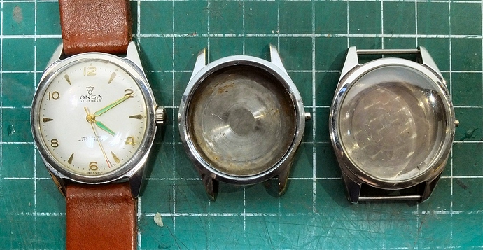 Twee daarvan waren vrijwel nieuwe en onbeschadigde kastje van twee HMT horloges die ik ooit eens aangeschaft had. In een tijd voordat ik geleerd had dat je voor HMT Mumbay Specials moet oppassen. Die 2 HMT’s werkten inderdaad voor geen meter. (Ik heb ook nog een paar andere, die het wèl goed doen). Die 2 slechte heb ik dus gesloopt en de diverse onderdelen verdwenen in doosjes, want ik gooi zelden zomaar wat weg. Ik weet niet meer hoe, maar ik heb ze teruggevonden en wat bleek? De 2 HMT kastjes waren vrijwel identiek van vorm als het kastje van de Onsa maar ze waren wèl van staal en beter nog: het Onsa/AS1686 uurwerkje paste er perfect in, ook de plek van de doorvoer voor de opwindas klopte. Dilemma, het ene HMT kastje had ook een mooie merk neutrale caseback maar had iets te brede lugs, het andere kastje was perfect identiek, maar had een lelijke caseback. Beide achterkantjes waren slecht uitwisselbaar, het paste net niet lekker. De caseback van het versleten Onsa kastje was ook nog mooi en natuurlijk origineel.
