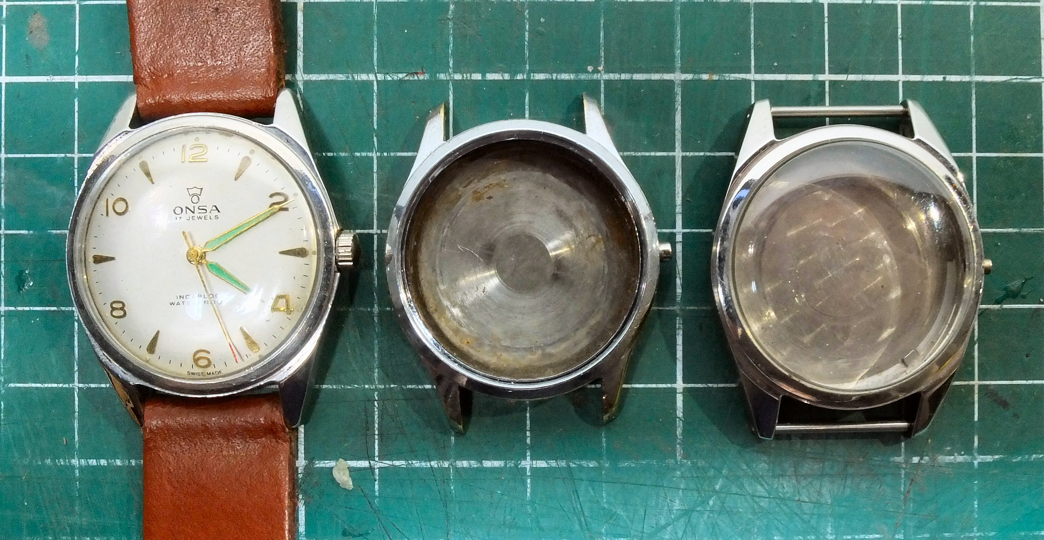 Links de Onsa in haar nieuwe HMT jas, maar met de oorspronkelijke caseback, in het midden het oude Onsa kastje met de lelijke HMT caseback en rechts het niet gebruikte complete HMT kastje dat nog mag wachten op een andere bewoner.