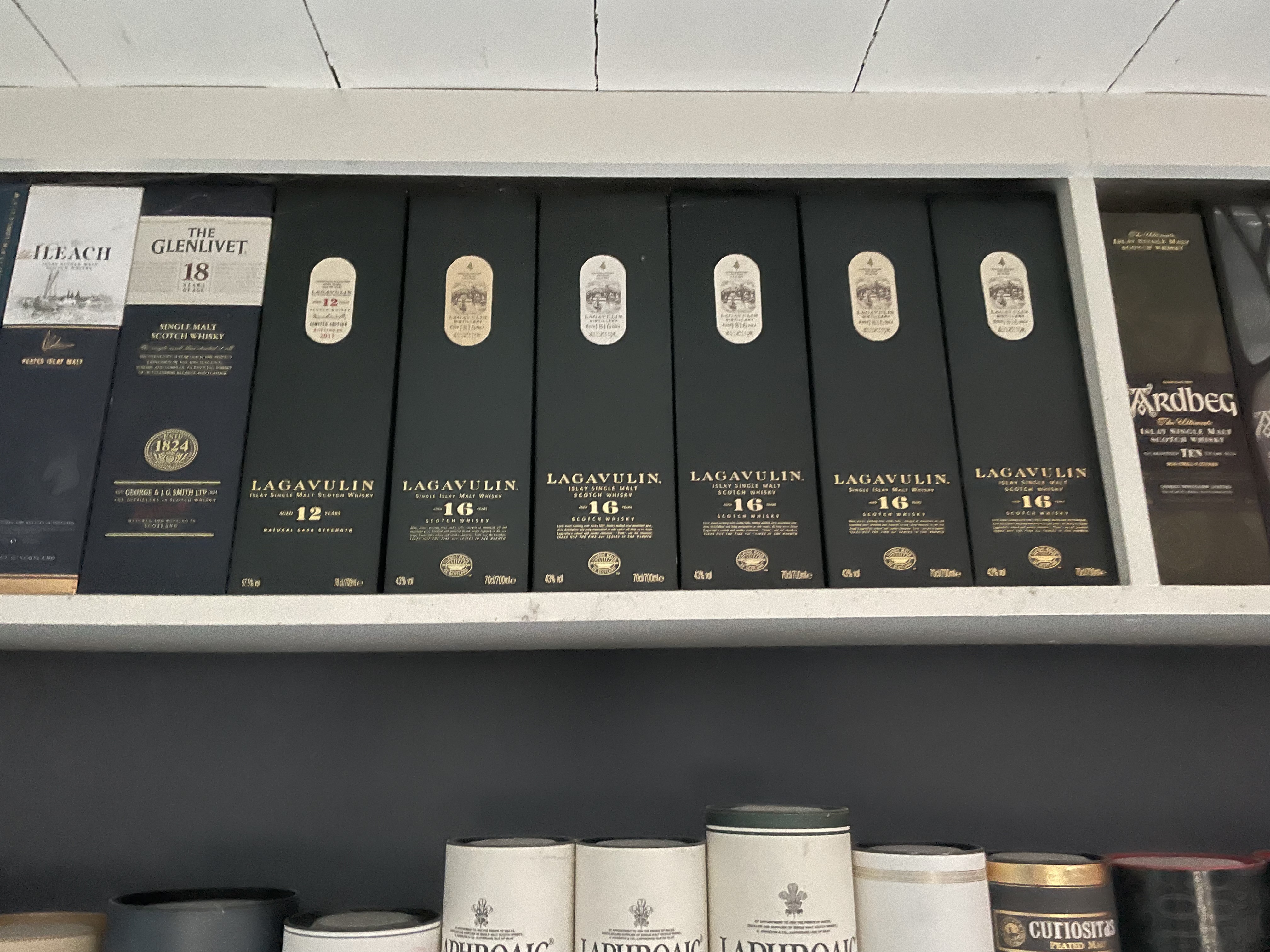 Lagavulin 16 zei hij… en, i kid you not, dat is dus ook mijn favoriete whisky getuige de 6 lege flessen die ik compulsief bewaar omdat ik dat soort dingen gewoon niet graag weggooi.