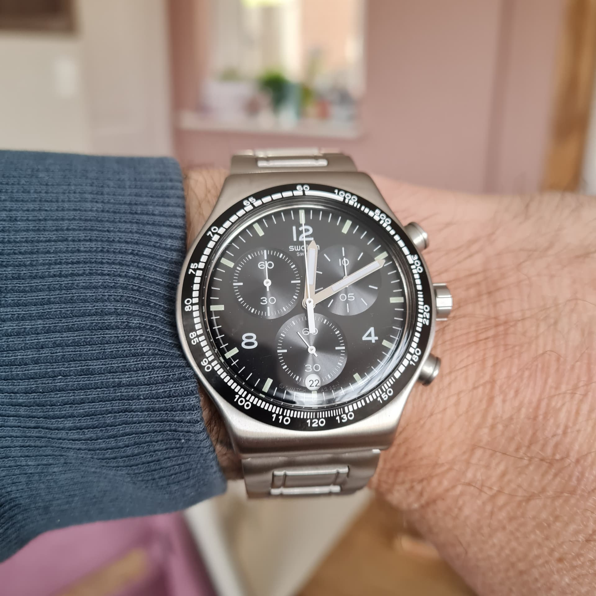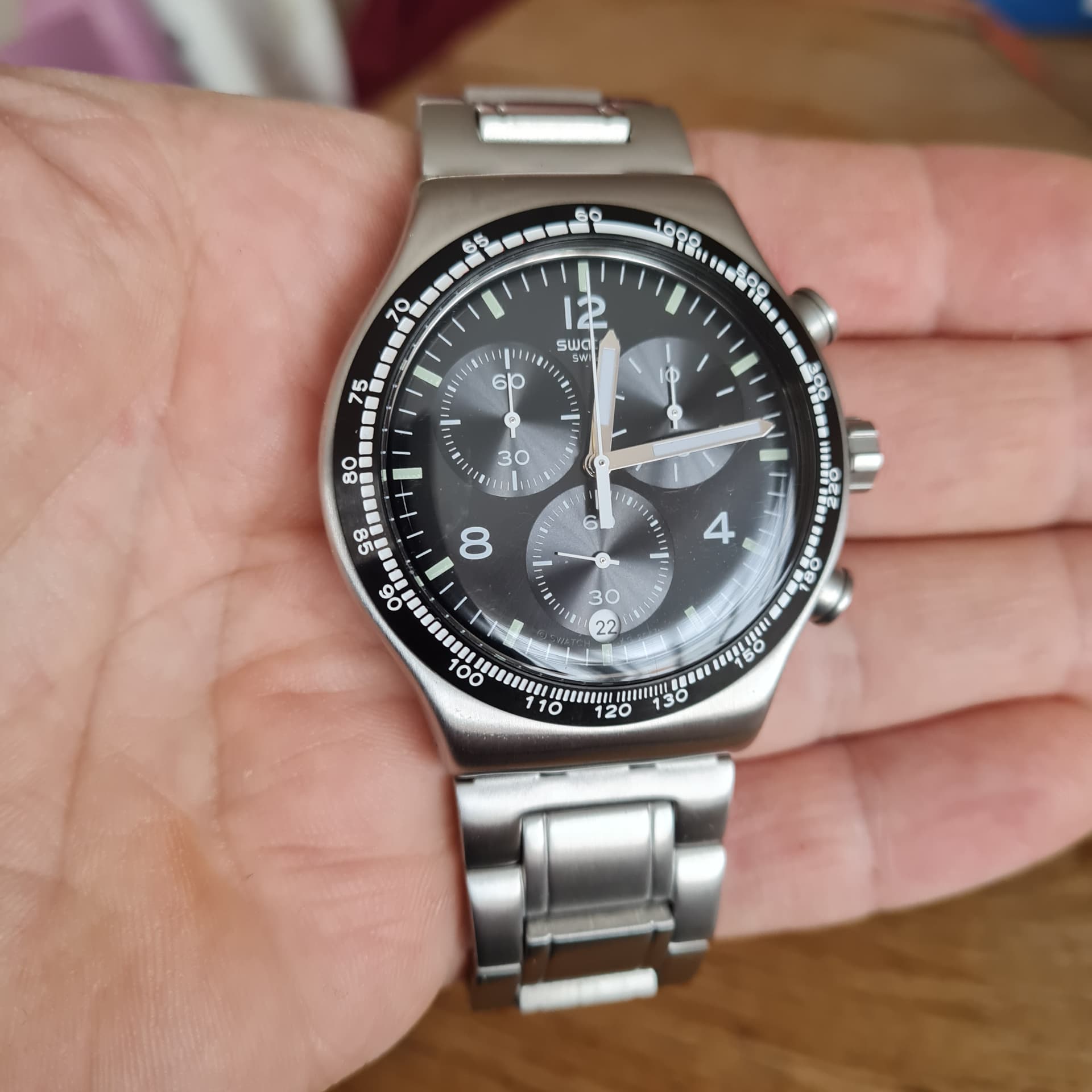 De 2e NA kwam ik toevallig tegen hier op HF. Ik had deze een tijdje geleden al eens bekeken op de site van Swatch, een mooie grote stalen chrono, de Night Flight. Maar goed, niet nodig dus die komt wel een keer en zoals wel vaker hier op HF, @ImproveDaily was de schuldige, bedankt !! als je niet op zoek bent naar dan komt het vanzelf jou kant op en dat was precies het geval met de Night Flight. Gisteren binnengekomen en ook met deze ben ik zeer content. Nu ist doosje voor de stalen horloges ook weer vol dus voorlopig komt er niks meer